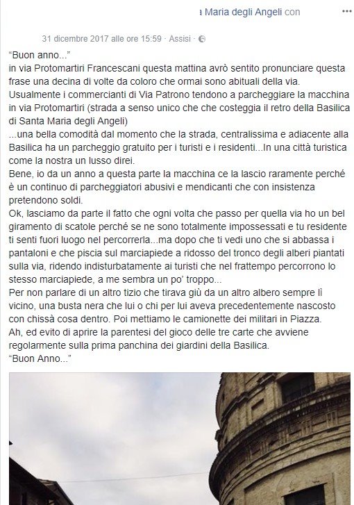 Ma non siamo la città della pace..della tolleranza..dell’accoglienza? Il vescovo giorni fa ha fatto una predica dicendo che dovreste ospitare questi poveri disgraziati a mangiare a casa vostra e se possibile ospitarli….loro no…le loro case di accoglienza sono alberghi però chiedono ai cittadini di ospitarli perché l’integrazione è una buona cosa ed aiuta a crescere mentalmente ed aprirsi agli altri….quindi cara sig.ra quando le impediscono di parcheggiare e li vede pisciare sul marciapiede lei deve chiamarli ed invitarli a casa….vedrà che le cose miglioreranno (per loro chiaramente)….QUANTA IPOCRISIA!!!!!
