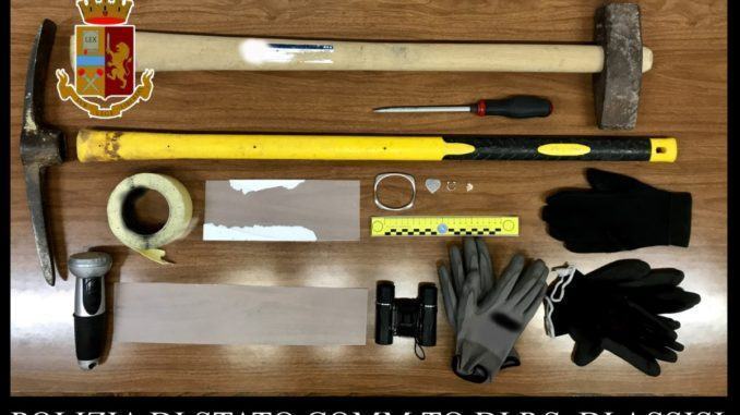 L’uomo non ha dato alcuna giustificazione della sua condotta. All’interno del veicolo gli attrezzi del “mestiere”, due grosse mazze, lastre di plastica solitamente utilizzate per forzare porte e finestre e alcune paia di guanti. Insomma, tutto l’occorrente, per andare a rubare.