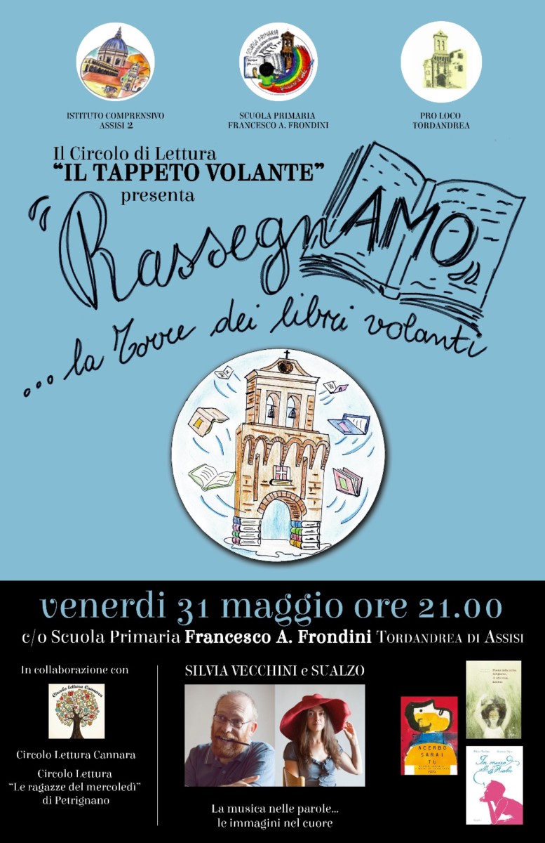Così, quale degna conclusione di un “esperimento culturale” a detta di tutti ben riuscito,“Il Tappeto volante” chiuderà in bellezza la sua prima Rassegna di lettura con un appuntamento speciale, pensato e voluto per gli amanti della narrativa per ragazzi in collaborazione con il Circolo di lettura del vicino Comune di Cannara e con il Circolo di lettura “Le ragazze del mercoledì” di Petrignano d’Assisi.Quindi,se amate le avventure a lieto fine ed i racconti che tengono con il fiato sospeso, non prendete altri impegni! Venerdì 31 maggio alle ore 21:00, presso la scuola primaria F.A. Frondini, il Circolo avrà l’onore di ospitare due personaggi d’eccezione, la cui fama sta superando i confini nazionali grazie ad un repertorio narrativo vastissimo e pluripremiato:Silvia Vecchini e Sualzo.
