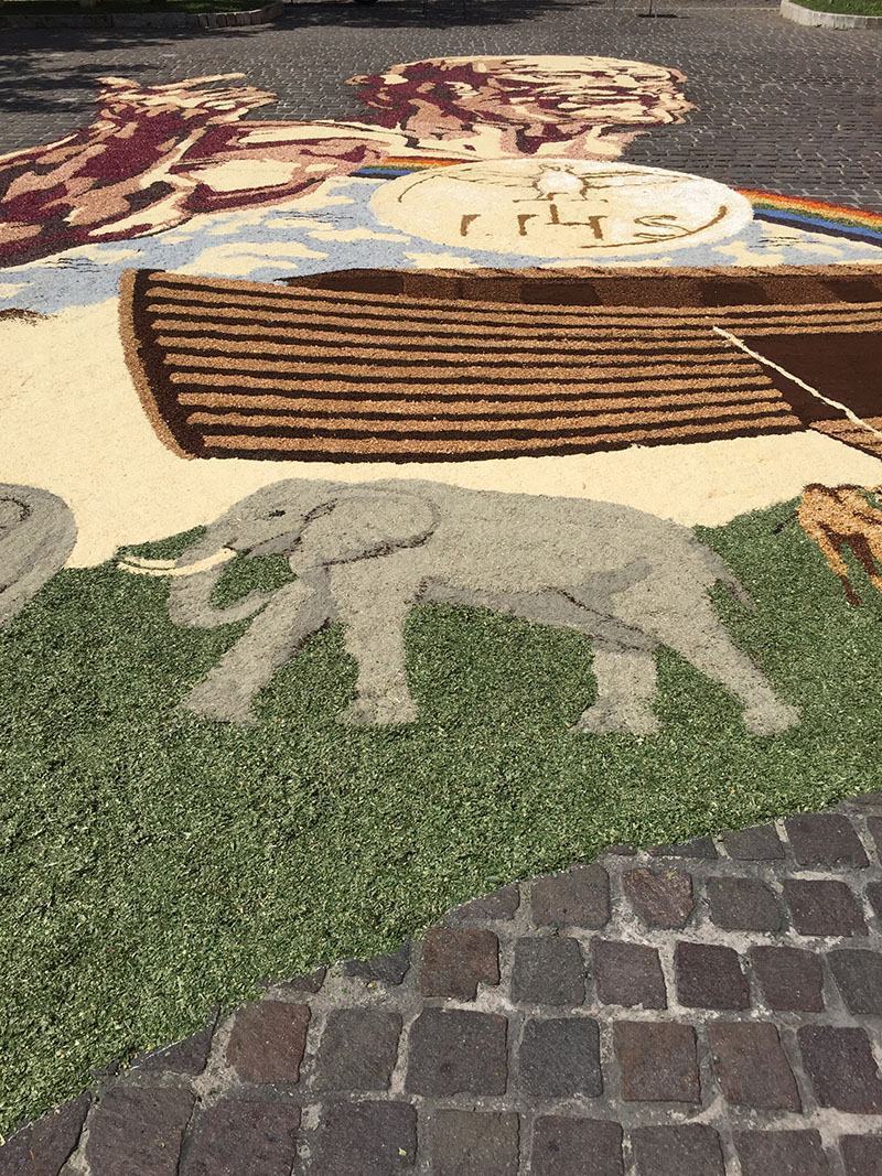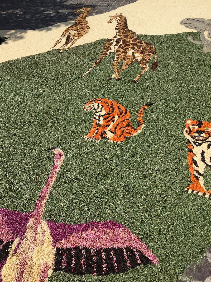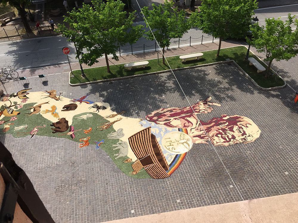 Quest’anno l’argomento trattato è stato quello del “Diluvio Universale” e pertanto c’era chi poneva fiori di vari colori per realizzare tigri, elefanti, cammelli, cavalli, uccelli e altri tipi di animali, mentre altri si occupavano della maestosa arca.