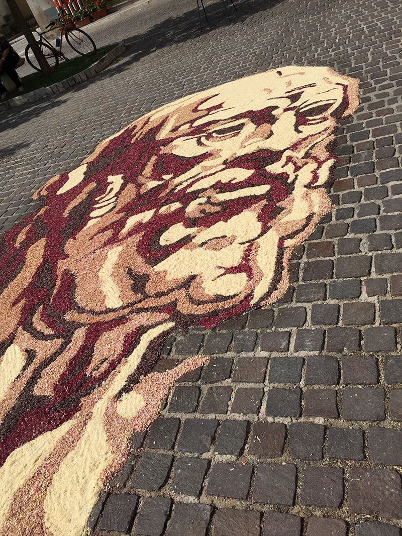 L’artefice e regista principale del progetto di questa infiorata è Roberto Belli, che per mesi ha lavorato alla realizzazione del tema e dei disegni dell’infiorata.