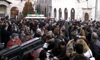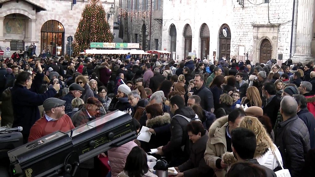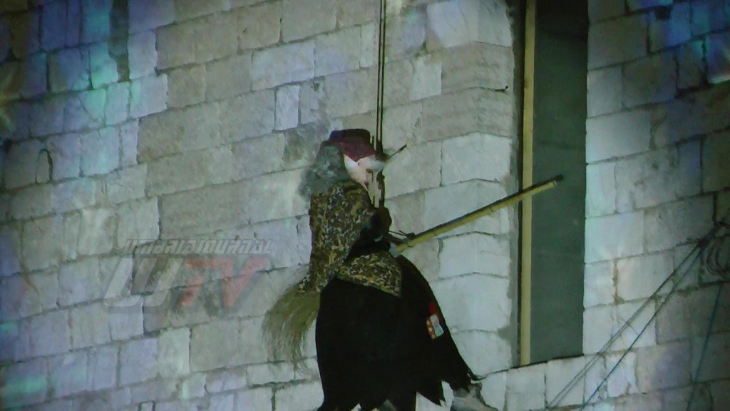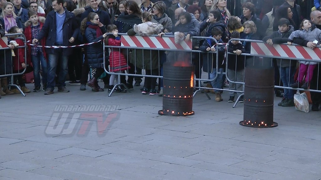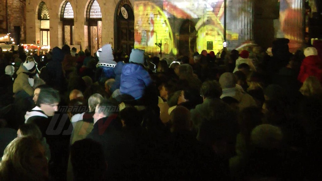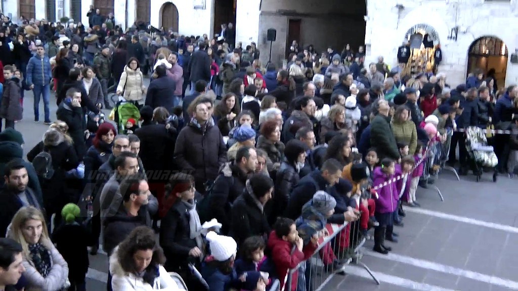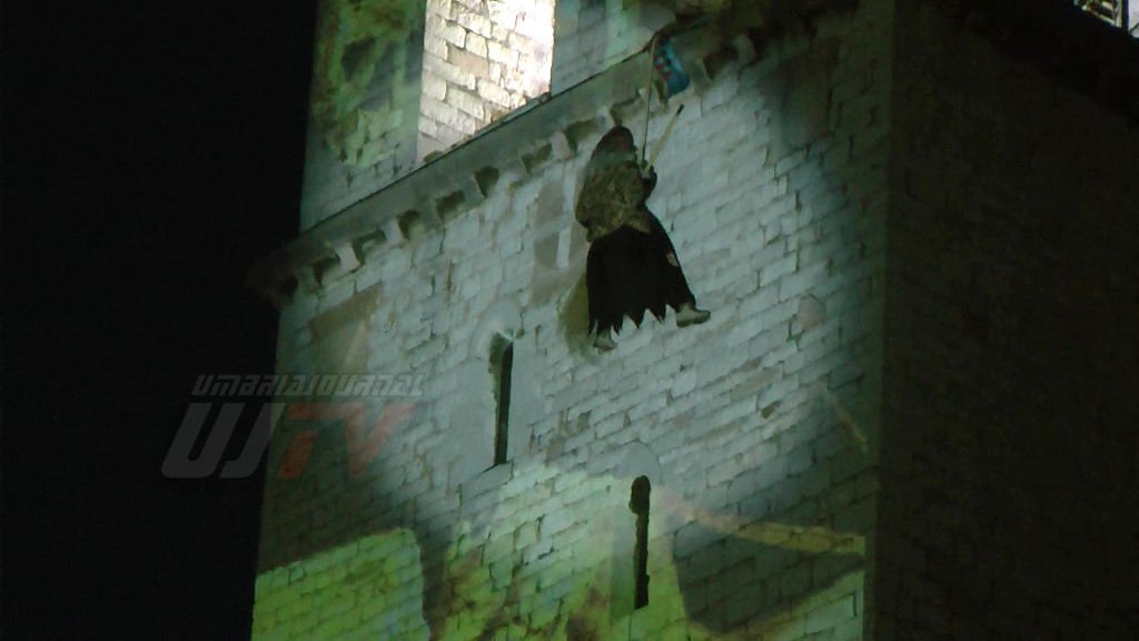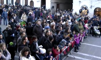 ASSISI -Si è fatta attendere la signora Befana. Un po’ in ritardo, alla fine incoraggiata dal coro di tanti bambini, si è calata giù con la sua scopa dalla Torre del Popolo di Assisi, in piazza del Comune. Oggi pomeriggio tantissime persone sono arrivate in città per vedere questo straordinario evento promosso dal comune e dalla Pro Loco di Assisi. Bambini ansiosi e genitori che incitavano i loro piccoli a guardare verso la torre, alta 47 metri. E’ proprio da lì che la vecchietta è scesa giù.
