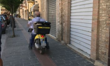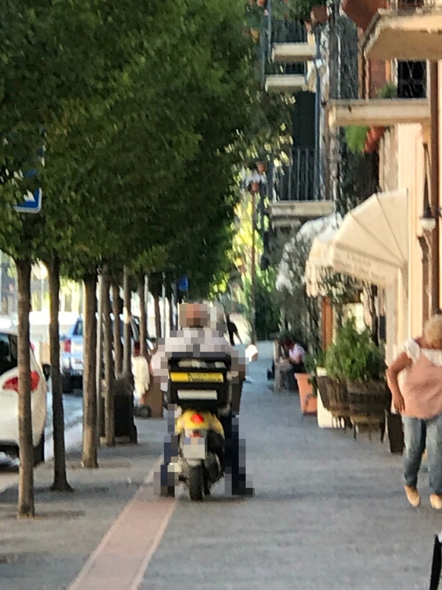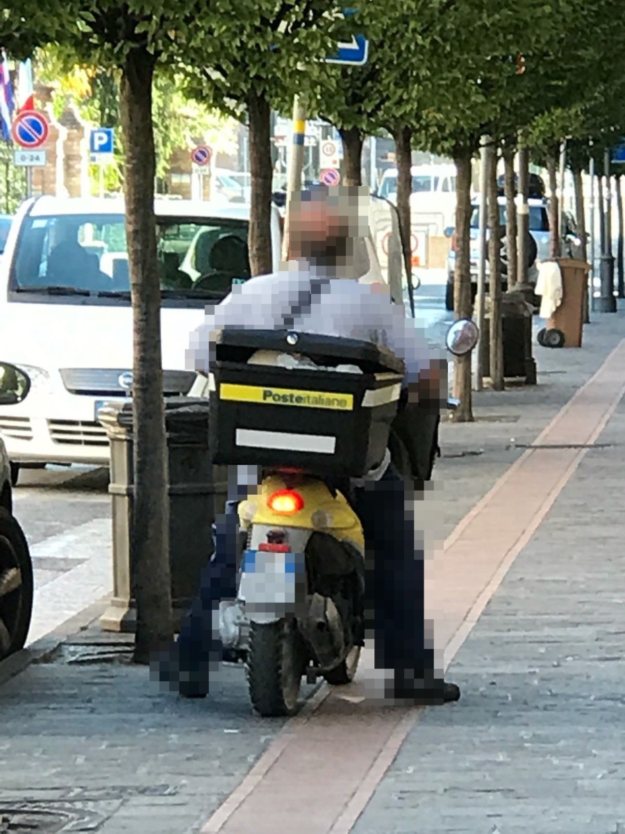Consegna della posta con lo scooter transitando sopra i marciapiedi