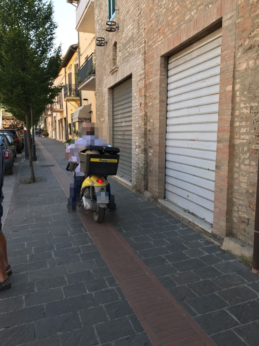 SANTA MARIA DEGLI ANGELI – In teoria non si dovrebbe fare, ma in pratica lo fanno tranquillamente. E’ la consegna della posta con lo scooter transitando con la moto sopra i marciapiedi che sono pedonali e destinati alle persone che camminano a piedi. Quanti di voi li hanno visti? Questo succede a Santa Maria degli Angeli.