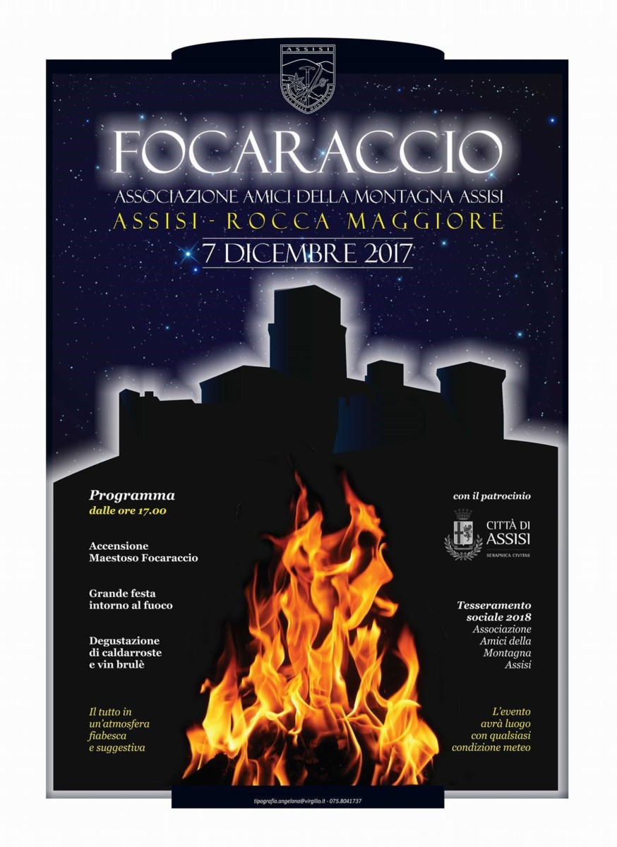 ASSISI – Un’usanza che si rinnova ogni anno quella del Focaraccio dell’Immacolata, grazie all’assiduo impegno messo a disposizione, già dai mesi precedenti, da tutto il direttivo e dai soci volontari dell’associazione Gli Amici della montagna. Un evento che si tramanda da padre in figlio, da socio anziano a socio giovane per continuare a mantenere viva una tradizione secolare, migliorandola ogni anno con tante novità, come la nuova cassetta per la distribuzione del vin brulé e delle caldarroste, e rendendola sempre più un appuntamento immancabile nell’agenda degli assisani. Quest’anno l’evento è inserito nel programma del Natale ad Assisi, accendi il Cuore della Festa. Appuntamento è come sempre il 7 dicembre alla Rocca Maggiore di Assisi, a partire dalle ore 17. L’evento si svolgerà anche in caso di condizioni meteo avverse.