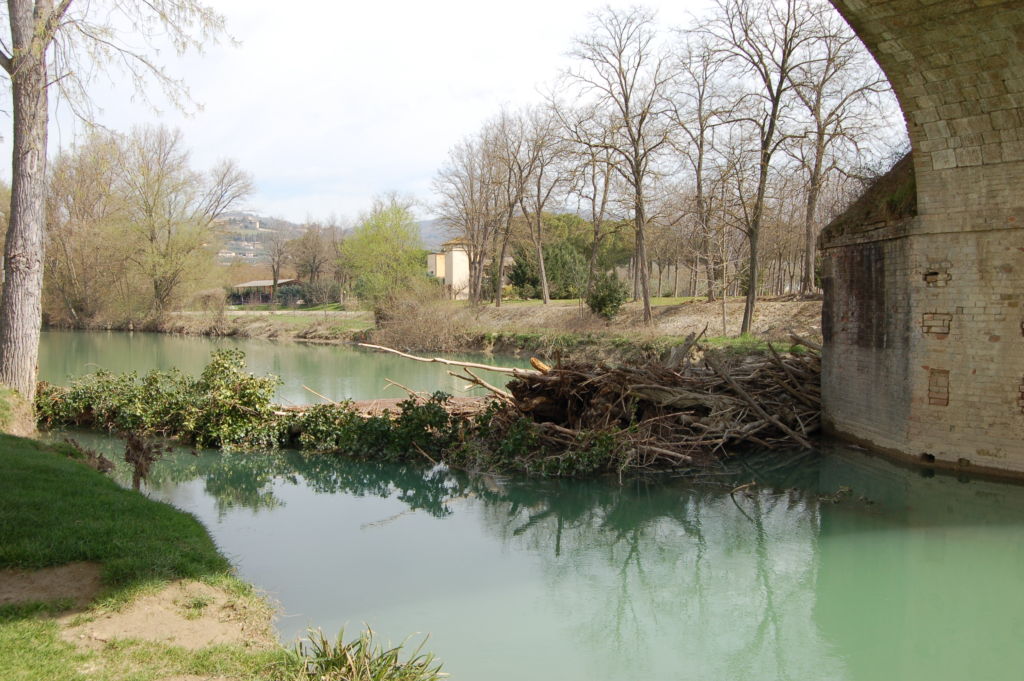 A pochi passi di distanza vi è un altro esempio inammissibile di degrado: il ponte sul Chiascio. Al rigonfiamento della struttura muraria che si affaccia su Via del Castello, alle pietre sconnesse e all’infiltrazione di acqua piovana sotto le arcate, oramai a conoscenza di tutti, negli ultimi tempi si è aggiunto un nuovo esempio di incuria: giorno dopo giorno, settimana dopo settimana, numerosi tronchi si sono incagliati sui piloni formando una vera e propria diga, la quale impedisce il normale scorrimento del fiume e può diventare causa di esondabilità in caso di piena.