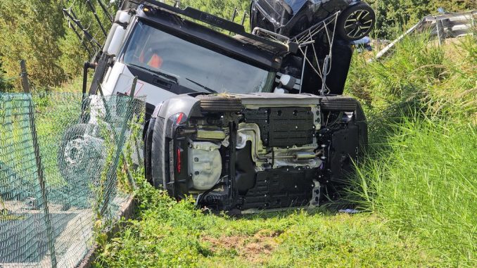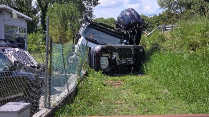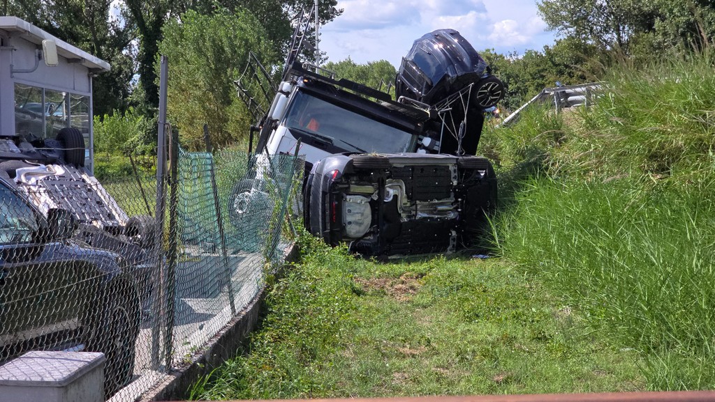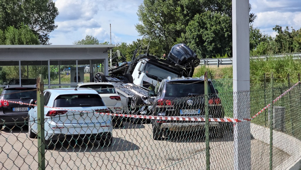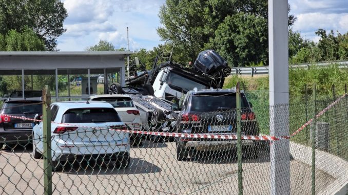 Secondo quanto ricostruito dalle autorità, il mezzo pesante avrebbe tamponato violentemente la Renault, che si trovava sulla carreggiata. In seguito all’urto, la bisarca si è ribaltata, finendo dalla sopraelevata sulla strada sottostante, nei pressi di un’autofficina Volkswagen, dove ha colpito una T-Roc parcheggiata all’esterno dell’azienda. L’automezzo pesante trasportava quattro automobili.