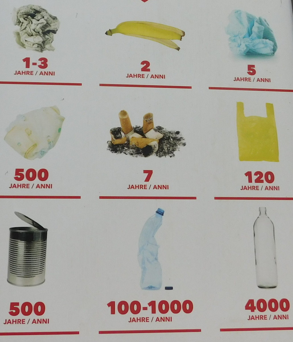 Ricordo che la natura impiega tre anni per degradare appena un pezzo di carta. Non parliamo poi della latta, la quale può essere assimilata all’humus terreste non prima di 500 anni; per la plastica ci può volere anche 1000 anni, e per il vetro ben 4000 anni.