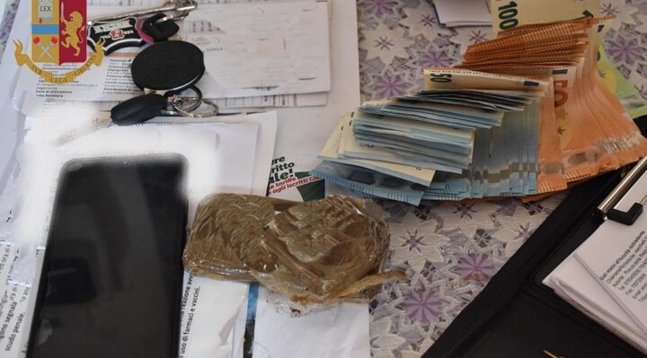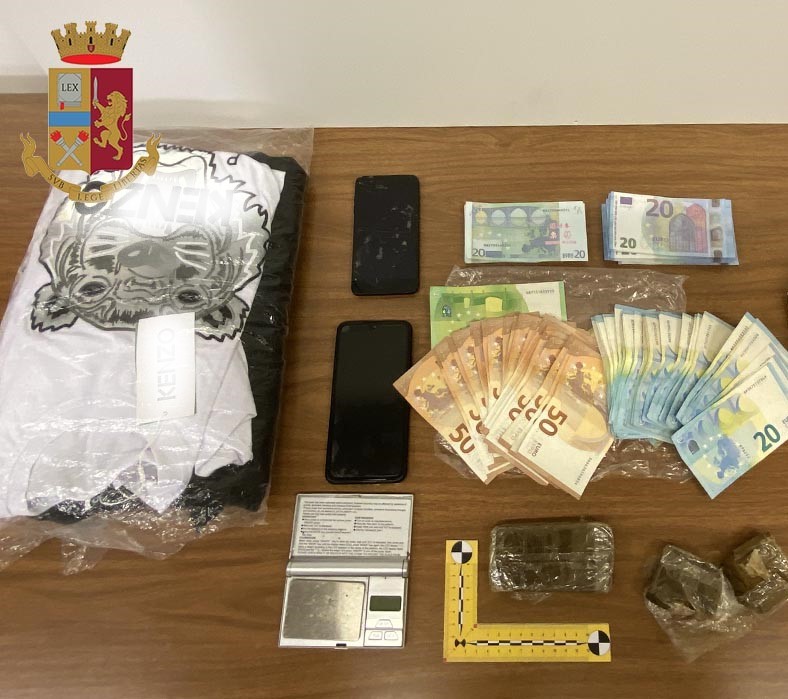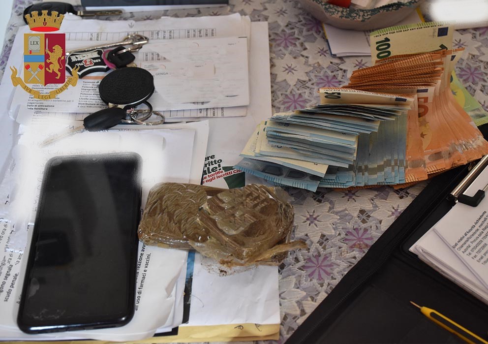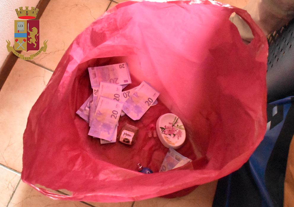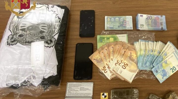 Nel corso della perquisizione delegata dall’Autorità Giudiziaria, gli agenti riuscivano a rinvenire 1 panetto intatto di hashish, del peso di un etto ancora confezionato, 2 altri panetti già aperti del peso complessivo di un etto, la somma di 2800 euro in banconote da 100, 50 e 20 euro, quasi 200 banconote false da 20 euro, e diverse magliette griffate, tutte ancora munite di cartellino.