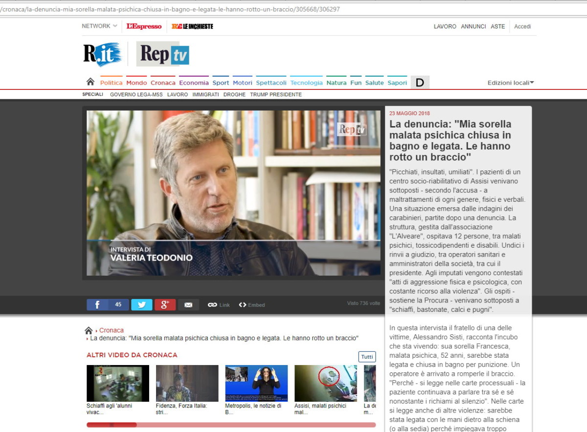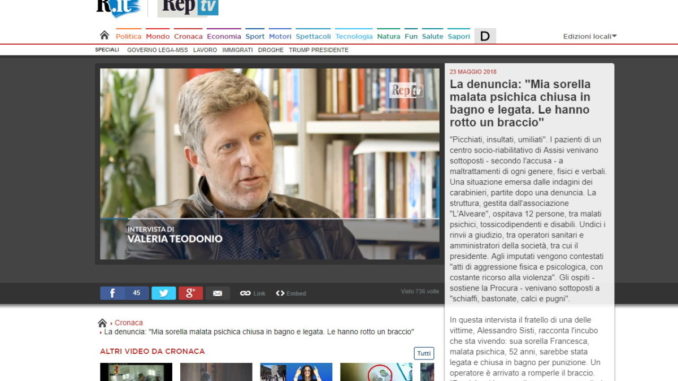 In questa intervista il fratello di una delle vittime, Alessandro Sisti, racconta l’incubo che sta vivendo: sua sorella Francesca, malata psichica, 52 anni, sarebbe stata legata e chiusa in bagno per punizione. Un operatore è arrivato a romperle il braccio. “Perché – si legge nelle carte processuali – la paziente continuava a parlare tra sé e sé nonostante i richiami al silenzio”. Nelle carte si legge anche di altre violenze: sarebbe stata legata con le mani dietro alla schiena (o alla sedia) perché impiegava troppo tempo a mangiare. E poi chiusa in bagno più volte.