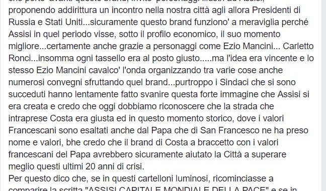 Tornando ad Assisi ho letto nei cartelloni luminosi “benvenuti ad Assisi città della pace“…allora mi sono ricordato, visto che è stato un periodo che ho vissuto, quando Assisi circa 30 anni fa, Assisi era conosciuta come “Capitale Mondiale della Pace”….fu Gianfranco Costa, sia da Sindaco e non, che porto’ avanti questo brand, invito’ personaggi illustri ad Assisi, proponendo addirittura un incontro nella nostra città agli allora Presidenti di Russia e Stati Uniti…sicuramente questo brand funziono’ a meraviglia.