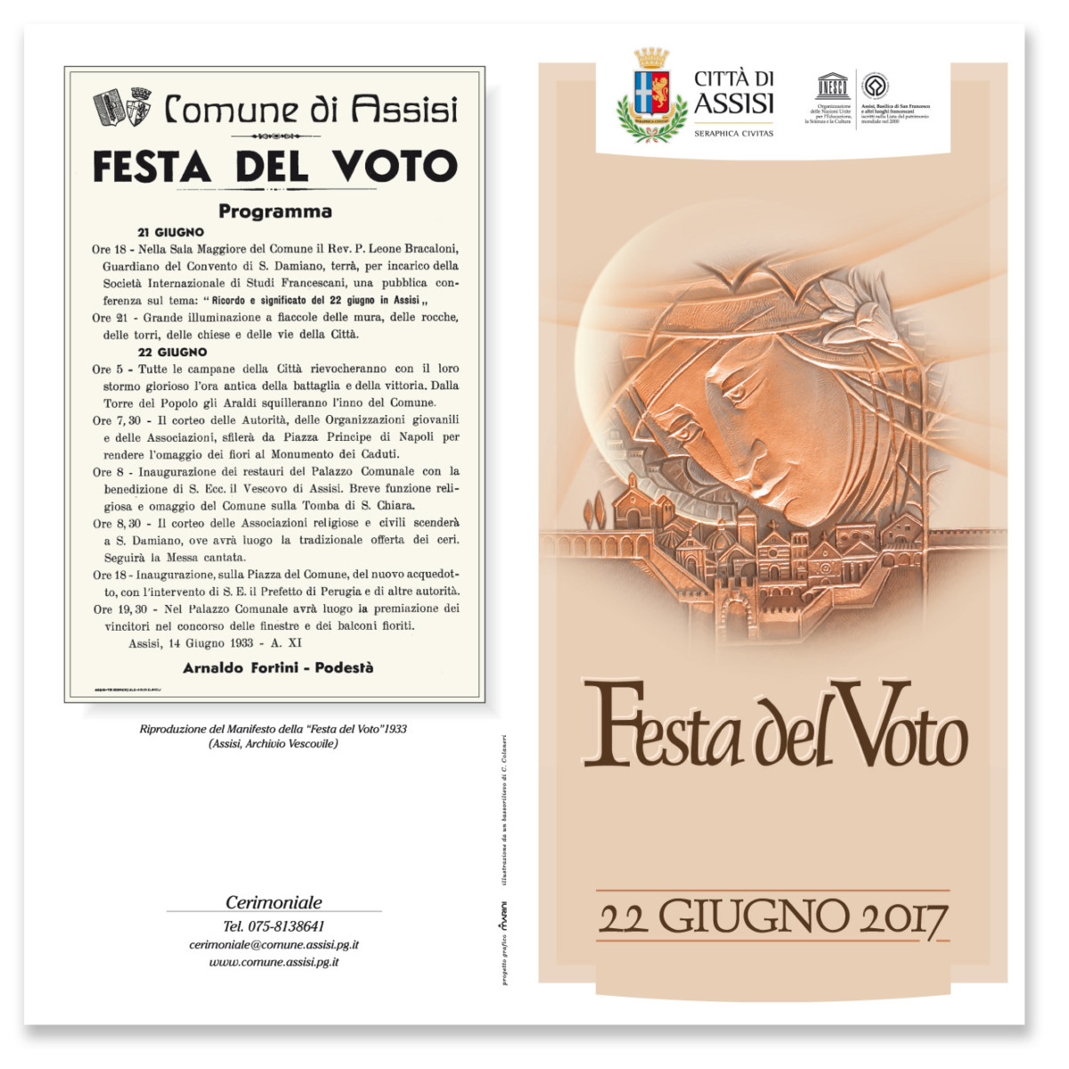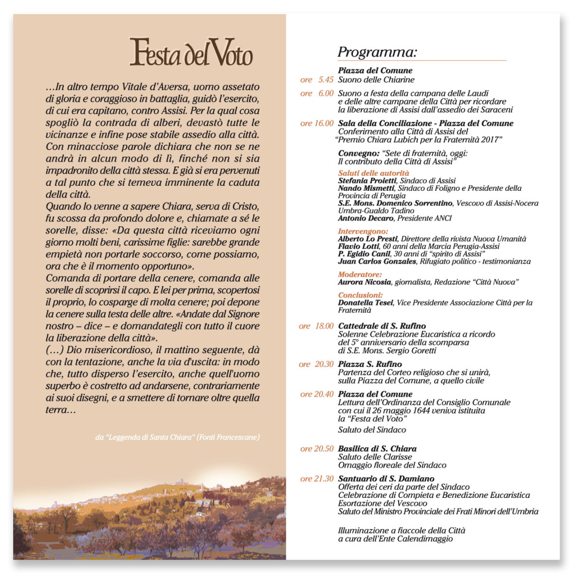 Alle 20,30 è prevista la partenza del corteo religioso che da piazza San Rufino si unirà a quello civile in piazza del Comune dove verrà letta l’ordinanza del consiglio comunale, con cui il 26 maggio 1644 veniva istituita la “Festa del voto”; seguirà il saluto del sindaco. Alle 20,50 presso la basilica di Santa Chiara ci sarà il saluto delle sorelle clarisse con l’omaggio floreale del sindaco; alle 21,30 presso il santuario di San Damiano seguiranno l’offerta dei ceri da parte del primo cittadino, la celebrazione di compieta e benedizione eucaristica, l’esortazione del vescovo e il saluto del ministro provinciale dei Frati minori dell’Umbria.