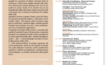 ASSISI – Giovedì 22 giugno torna il consueto appuntamento con la “Festa del voto” in onore di Santa Chiara che quest’anno è arricchito da una speciale celebrazione, l’assegnazione alla città di Assisi del premio “Chiara Lubich per la Fraternità 2017” da parte della Associazione nazionale comuni per la fraternità. “La motivazione del suddetto premio alla città – spiega padre Egidio Canil, responsabile della commissione dello Spirito di Assisi – giunge dalla costante disponibilità della città nell’accogliere e sostenere la ‘marcia Perugia-Assisi’, dalle innumerevoli manifestazioni che da 30 anni sono collegate con lo ‘Spirito di Assisi’ e dall’impegno della comunità a diffondere nella società e nel mondo di oggi lo spirito della fraternità”.