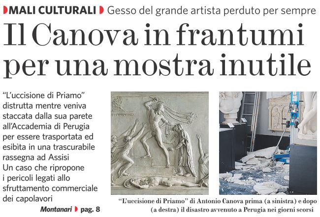 Questa mattina di nuovo un attacco alla Mostra su Antonio Canova considerata “inutile”. Innanzi tutto ringraziamo in quanto tutta questa pubblicità nazionale sta portando molti visitatori in Assisi (Palazzo Monte Frumentario, sino al 6 Gennaio 2013, con oltre 60 opere, il maggior numero mai portato in Umbria contemporaneamente). Poi ricordiamo che l’incidente avvenuto al “calco in gesso” (copia) si é verificato in Perugia presso l’Accademia delle Belle Arti (illustre e benemerita istituzione culturale perugina e nazionale) e che l’opera sarà restaurata come doveroso (Foto, una delle opere in Mostra).