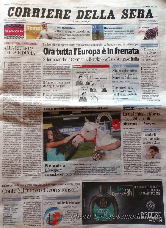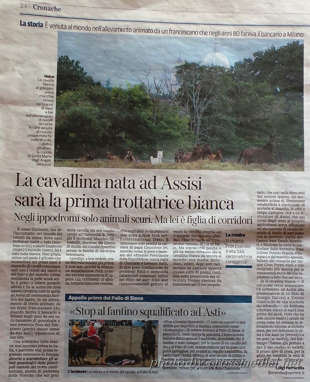 Una mezza pagina dedicata alla figlia di Melodiass. Anche il Corriere della Sera parla della famosa trottatrice bianca. “Piccola, albina e fa sognare il mondo del trotto”. Apre così l’articolo in prima pagina il giornale nazionale. Una bella foto la mostra in tutto il suo splendore. “Un Calimero al contrario. Negli ippodromi corrono soltanto cavalli scuri e lei è una trottatrice tutta bianca, albina con sottocute rosa. E’ l’attacco dell’articolo da curato da Luigi Ferrarella.