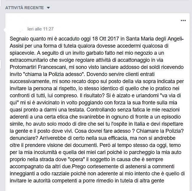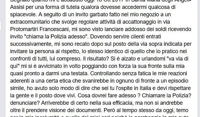Segnalo quanto mi è accaduto oggi (18 Ottobre 2017 ndr) in Santa Maria degli Angeli- Assisi per una forma di tutela qualora dovesse accedermi qualcosa di spiacevole. A seguito di un invito garbato fatto nel mio negozio a un extracomunitario che svolge regolare attività di accattonaggio in via Protomartiri Francescani, mi sono visto lanciare addosso dei soldi ricevendo invito “chiama la Polizia adesso“.