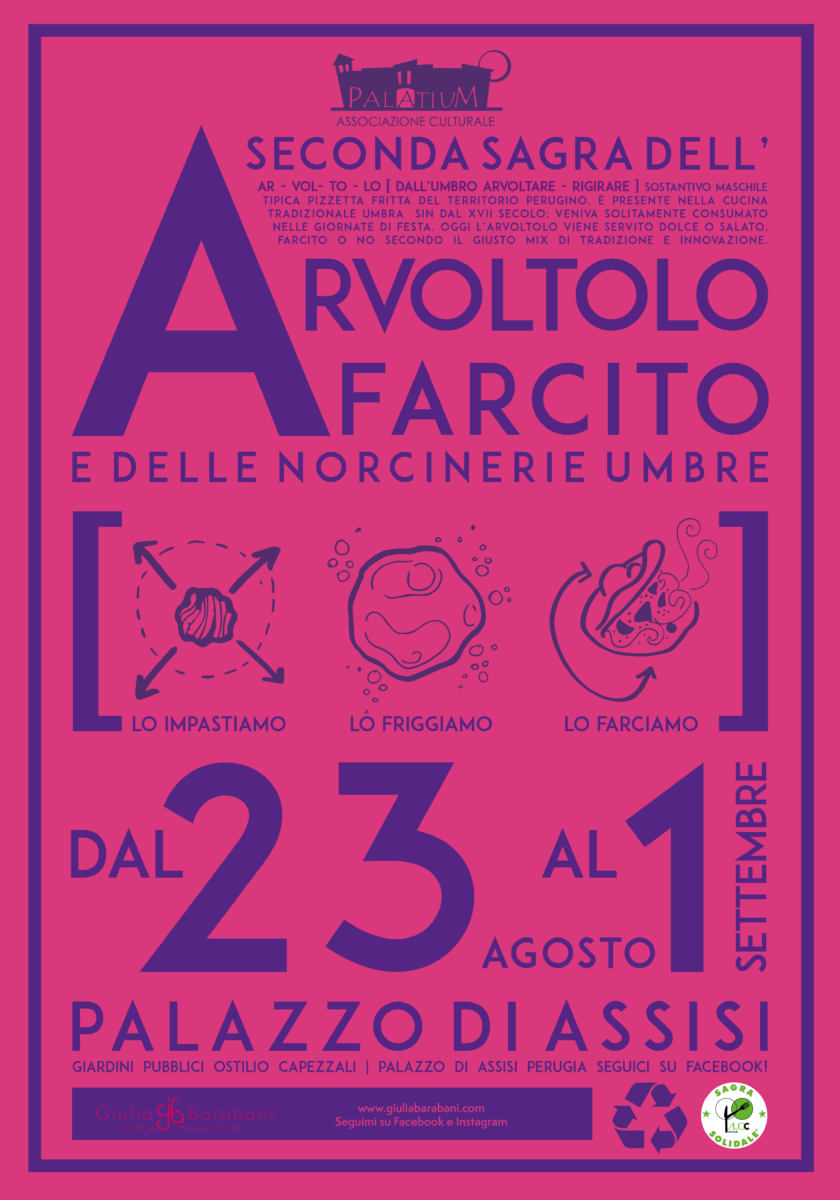 Al via questa sera la 2° Sagra dell’arvoltolo farcito e delle norcinerie umbre, rassegna enogastronomica che nasce da un’idea tanto folle quanto poetica dell’ Associazione Culturale Palatium; gruppo di Palazzani e non di tutte le età, accomunati dal desiderio di far vivere l’estate di questo piccolo paese ai piedi di Assisi.