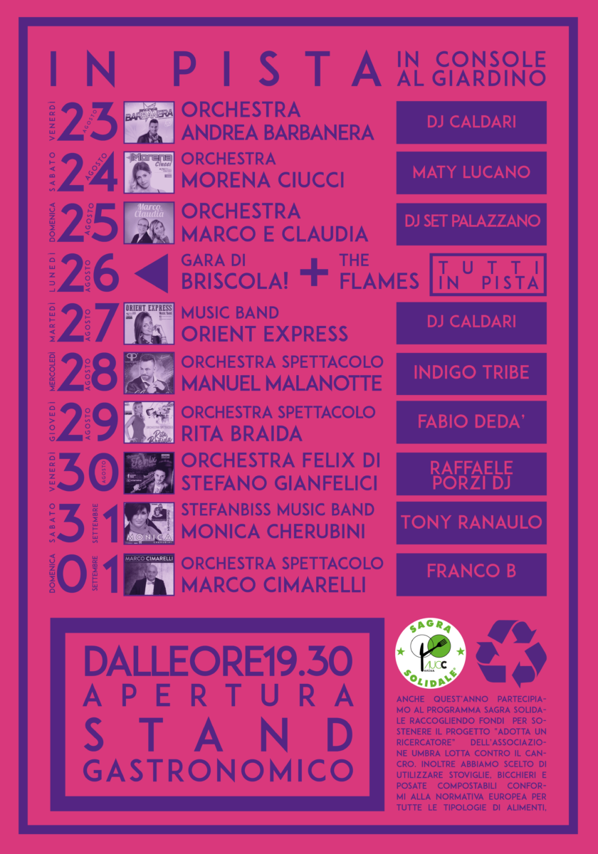 Inutile dirvi che ogni sera non mancheranno orchestre spettacolo, per proseguire la serata insieme, in pista anche dopo cena. In giardino djset e cocktails bar ma soprattutto anche una gara di solidarietà. Associazione Palatium anche quest’anno ha scelto di aderire al progetto Sagra Solidale promosso da AUCC, associazione umbra per la lotta contro il cancro incoronando l’arvoltolo palazzano (che trovate in menù ogni sera) come arvoltolo solidale.