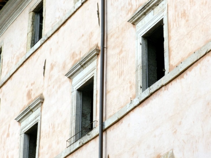 La parte alta che dà sulla strada , dopo la ristrutturazione del terremoto, è rimasta allo stato grezzo e le finestre ( in cattivo stato ove ci sono ancora ) in alcuni casi sono state sostituite da retine che si sono ben presto lacerate lasciando i locali all’aperto e in balia degli eventi atmosferici e dei piccioni.
