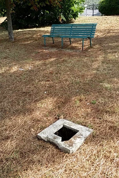 PALAZZO DI ASSISI da Alex Trabalza – Pericolosi tombini senza coperchio ai giardini! Ci troviamo a Palazzo di Assisi, precisamente in via Agnano,in un piccolo giardino pubblico dal nome molto importante Area Verde Madonna Di Lourdes. Subito all’entrata ci imbattiamo nell’ormai noto cartello vietato introdurre cani, e solamente due passi in avanti ed ecco presentarsi il primo tombino, con il tappo – coperchio non fissato, basta metterci un piede sopra e diventa una trappola micidiale.