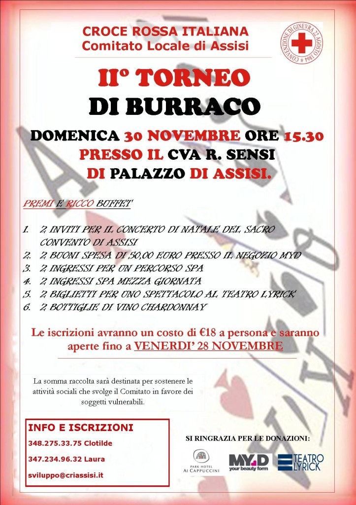 La Croce Rossa Italiana, Comitato Locale di Assisi organizza il II Torneo di Burraco a coppie domenica 30 novembre alle ore 15.30 presso il CVA R. Sensi di Palazzo di Assisi (Via Maceo Angeli). La somma raccolta sarà destinata per sostenere le attività sociali che svolge il Comitato in favore dei soggetti vulnerabili. Verranno messi in palio i premi per le prime sei coppie classificate: 2 inviti per il concerto di Natale organizzato dal Sacro Convento di Assisi 2 buoni spesa per un valore di € 50,00 da utilizzare presso il negozio MYD 2 ingressi per un percorso Spa 2 ingressi di mezza giornata in Spa 2 biglietti per uno spettacolo presso il Teatro Lyrick 2 bottiglie di vino Chardonnay Durante la serata sarà servito un buffet. Le iscrizioni saranno aperte fino a venerdì 28 novembre, chiamando i numeri 348 2753375 Clotilde, 347 2349632 Laura o inviando una e mail a sviluppo@criassisi.it