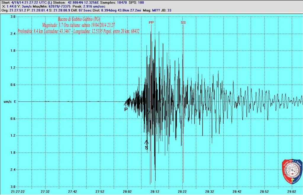 UMBRIA – Un terremoto di magnitudo(Ml) 3.7 è avvenuto alle ore 23:27:53 italiane del giorno 19/Apr/2014 (21:27:53 19/Apr/2014 – UTC). Il terremoto è stato localizzato dalla Rete Sismica Nazionale dell’INGV nel distretto sismico: Bacino di Gubbio. I valori delle coordinate ipocentrali e della magnitudo rappresentano la migliore stima con i dati a disposizione. Eventuali nuovi dati o analisi potrebbero far variare le stime attuali della localizzazione e della magnitudo.