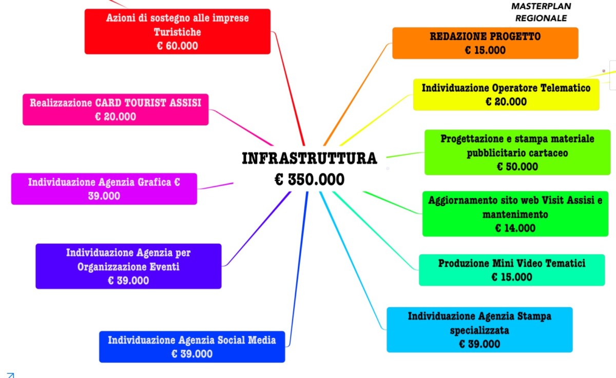 Non possiamo pensare o ridurre il Piano solamente a degli EVENTI. Nel Progetto Presentato c’è un capitolo denominato “Infrastruttura” che costituisce il cuore di tutto il Piano. Sono individuati una serie di interventi per un importo complessivo di € 350.000: cifra considerevole. Ma dal Bilancio Preventivo approvato non si riesce a comprendere se è stato finanziato interamente ed altrimenti quali sono i progetti finanziati e soprattutto se verrà dato un incarico a persona o gruppo per predisporre un progetto pluriennale della “Destinazione Assisi”.