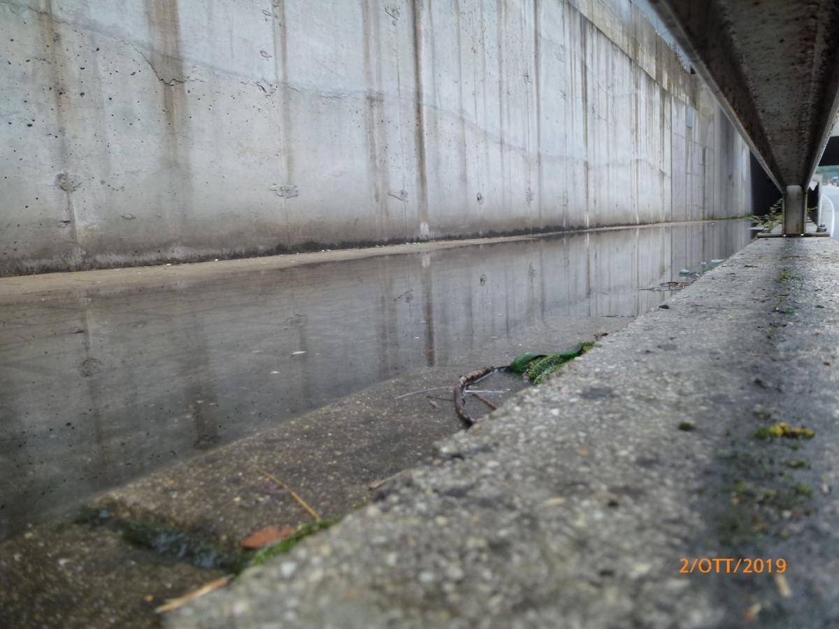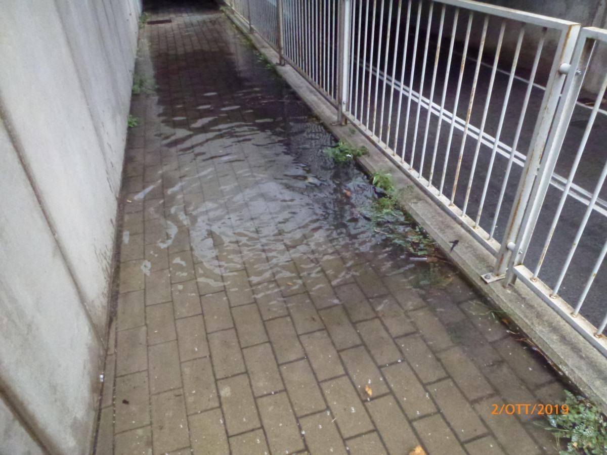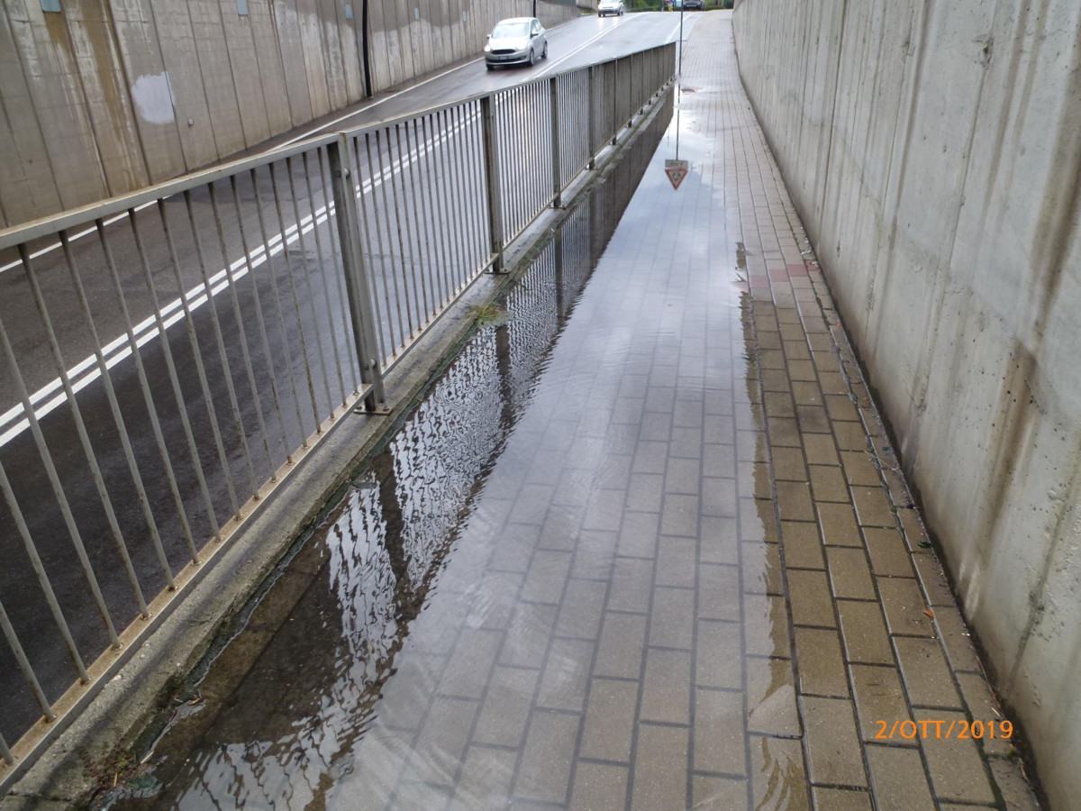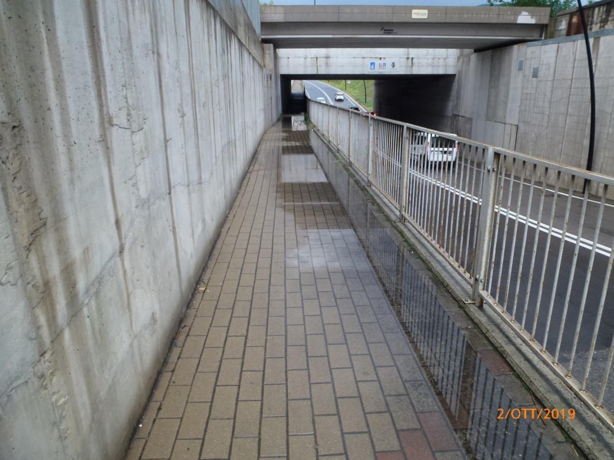La cosa più grave e fastidiosa e al contempo pericolosa, è l’allagamento di gran parte del percorso pedonale del sottopasso, al verificarsi di piogge abbondanti, come abbiamo potuto verificare proprio Mercoledì 2 ottobre 2019, dopo l’abbondante piovuta pomeridiana. Si vedano le foto allegate. Questo allagamento è dovuto al fatto che, essendo il percorso caratterizzato, indipendentemente dalla direzione che si affronti, da una pendenza iniziale, un tratto in falso piano, che di fatto è un avvallamento, e di un successivo tratto in pendenza. Nel tratto con quota più bassa, a parte dei fori con tubi di drenaggio, eseguiti sul sottostante muro, sembra dal Comune di Assisi tempo fa, questi non partono da nessuna griglia, ma dallo stato sottostante alla pavimentazione permeabile, e che si sono rilevati del tutto inutili a drenare l’acqua quando questa è abbondante (vedi foto allegate). Non vi sono altri sistemi di deflusso delle acque.
