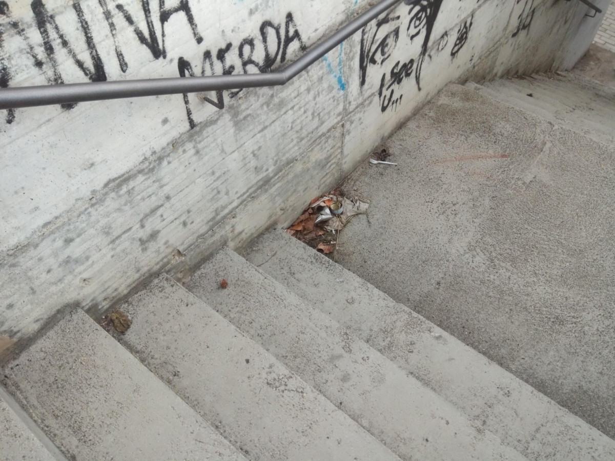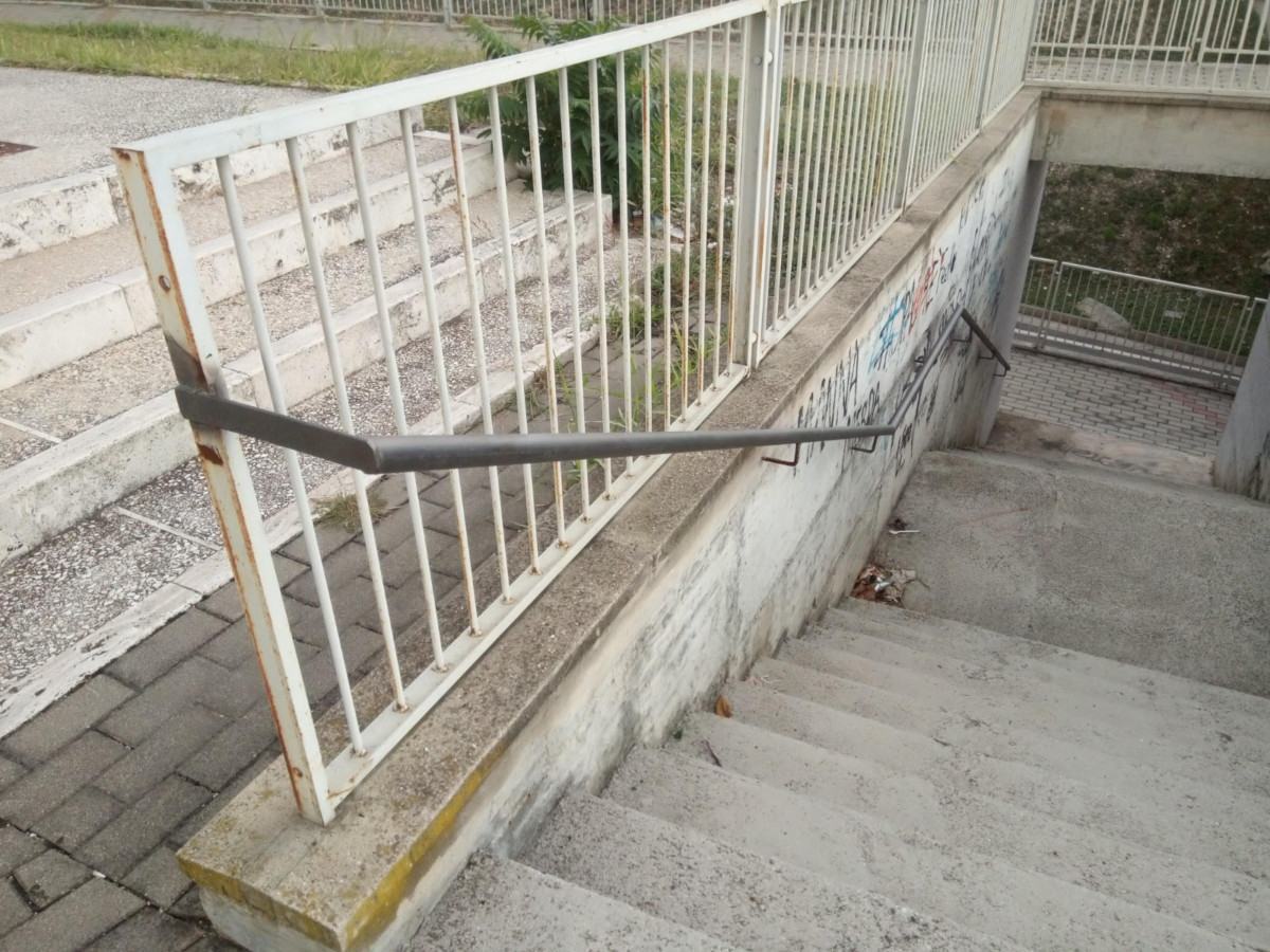 Iniziamo dalla scala che dall’angolo del Teatro Lyrick porta al sottopasso. Questa è spesso ricolma di immondizia di ogni genere, sovente ci viene riferito vi si trovano persino delle siringhe. Inoltre, questa scala, al contrario di tutte le scale pubbliche del Mondo, ha il corrimano solo da un lato, che sembra sia stato montato di recente. Mentre l’altro lato ne è totalmente sprovvisto. Ciò, oltre a causare pericolo per chi la percorre, impedisce a persone con ridotta mobilità, di avvalersi dei due corrimani, che aiuterebbero nel movimento, oppure se si incontrassero contemporaneamente in senso inverso, eviterebbero, come spesso succede, di percorrerla in senso alternato. Sempre al disopra della scala, nel viottolo che conduce alla parte opposta a Via D’Annunzio del teatro, vi è un improvviso e importante avvallamento del mattonato, che risulta essere pericoloso per la circolazione pedonale. Questo avvallamento è tra la zona in c.a. e quella dove tale tipo di mattonato è di norma allettato sulla sabbia, anche per favorire la permeabilità.