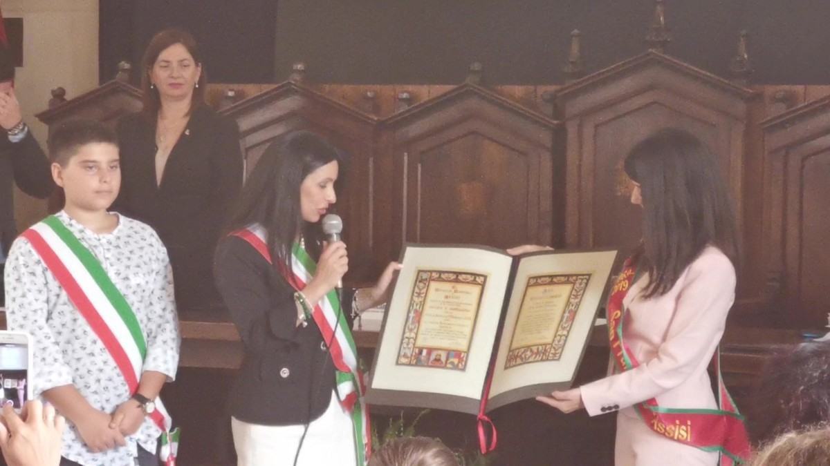 «Con emozione vi accolgo nella città che diede i natali al nostro Santo a cui voi siete tanto devoti e da cui avete ereditato il nome che è simbolo di pace nel mondo. Celebriamo in questo momento un evento storico e solenne che suggella il nostro legame mantenendo fede a un impegno assunto mezzo secolo fa. Con questi tre giorni consegniamo ai nostri giovani un’idea, il nostro gemellaggio che è e deve restare un patrimonio di valori autentici e irrinunciabili, il primo tra tutti la vocazione alla pace”.