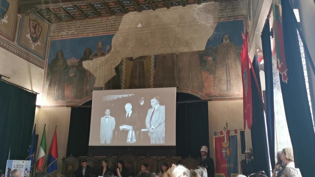 “Come sindaco di Assisi, la città di San Francesco, che ho l’onore di amministrare e rappresentare, voglio dare il benvenuto a chi dall’altra parte dell’oceano crede nei nostri ideali di fratellanza e accoglienza, che oggi ritiene importante con convinzione ed entusiasmo rafforzare quel legame di amicizia voluto e cercato 50 anni fa quando tutto era diverso e soprattutto più lontano”, ha detto Stefania Proietti, sindaco di Assisi.