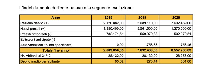 Si riporta di seguito la tabella relativa all’indebitamento del comune di Assisi al 31/12/2020, come certificato dai Revisori del comune nella Relazione al Rendiconto 2020 (pag. 22), che verrà approvato dalla maggioranza il prossimo 29 aprile.