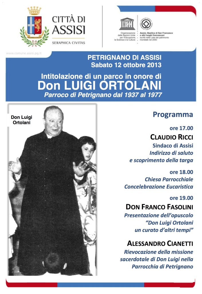 DON ORTOLANI LOCANDINA(umbriajournal.com) ASSISI – Domani, sabato 12 ottobre, a partire dalle ore 17.00 presso la frazione di Petrignano, avrà luogo l’intitolazione del parco in onore di Don Luigi Ortolani, Parroco dal 1937 al 1977. La cerimonia, cui tutta la cittadinanza è invitata a partecipare, si apre con i saluti del Sindaco della Città di Assisi per proseguire con lo scoprimento della targa. A seguire, sono previste la Concelebrazione Eucaristica presso la Chiesa Parrocchiale e la presentazione dell’opuscolo “Don Luigi Ortolani un curato d’altri tempi” di Don Franco Fasolini, accompagnata dalla rievocazione della missione sacerdotale di Don Luigi a cura di Alessandro Cianetti; il tutto nella parrocchia petrignanese. Don Luigi nacque a Cannara il 3 novembre 1912. All’età di undici anni entrò in seminario vescovile poi in quello regionale, dove nel 1933 ricevette la tonsura dal Vescovo di Assisi Monsignor Placido Nicolini. Nel 1936 conseguì la laurea con il massimo dei voti. Fu ordinato Sacerdote il 19 settembre 1936 in Santa Maria degli Angeli e celebrò la sua prima Messa solenne il 21 settembre dello stesso anno in Cannara nel corso della quale dette la prima comunione a sua sorella Maria che aveva sei anni. L’organo suonò la musica di Giuseppe Epifani, babbo di Guglielmo Epifani attuale segretario politico del PD e amico carissimo di Don Luigi. Dopo aver eseguito il ministero sacerdotale, Don Luigi è stato per alcuni mesi nella parrocchia di Collemancio. Agli inizi del 1937 il parroco Don Nabore Capezzali fu colpito da grave malattia e non fu più in grado di svolgere le funzioni religiose e il 24 giugno del 1937 il Vescovo Monsignor Placido Nicolini lo mandò in suo aiuto. Don Luigi sopperì alle esigenze della Parrocchia e assistette amorevolmente. Don Nabore che il 22 dicembre del 1937 spirò tra le sue braccia. Dopo la morte di Don Nabore, oltre centosettanta parrocchiani sottoscrissero e indirizzarono una petizione al Vescovo di Assisi pregandolo di nominare Don Luigi parroco effettivo. Monsignor Nicolini aderì alla richiesta e il 24 giugno del 1938 affidò a Don Luigi la reggenza della Parrocchia di Petrignano. Il primo gennaio 1990 il Vescovo Monsignor Goretti gli conferì la vicaria della parrocchia di Cannara con gli specifici compiti di occuparsi del ministero della confessione, della direzione spirituale e dare collaborazione alla vita pastorale. Mori il 21 settembre 1990, nello stesso giorno del 1936, festa di San Matteo, quando celebrò la sua prima Messa.