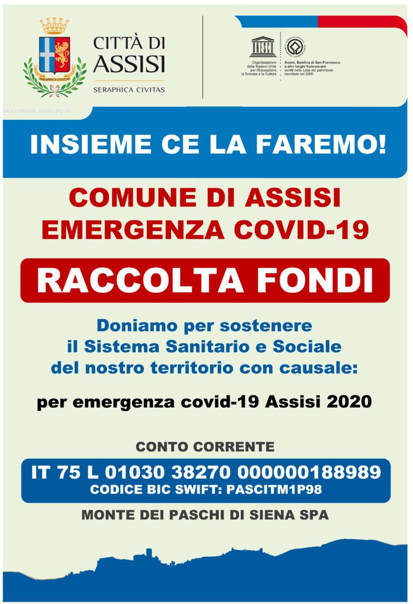 Il Comune di Assisi si fa promotore di una concreta iniziativa di solidarietà, come già fatto in passato in occasione di calamità eccezionali. In questa situazione di emergenza senza precedenti, il Comune di Assisi ha deciso di attivare un nuovo conto corrente presso la Tesoreria comunale Monte dei Paschi di Siena S.p.A. denominato ‘COMUNE DI ASSISI PER EMERGENZA COVID-19’ (IBAN IT75L0103038270000000188989) su cui indirizzare le donazioni che possono arrivare da parte di privati, di aziende e di associazioni al fine di contrastare gli effetti diretti e indiretti dell’emergenza che si è determinata nel territorio nazionale e in particolare sul tessuto sanitario e sociale di Assisi.