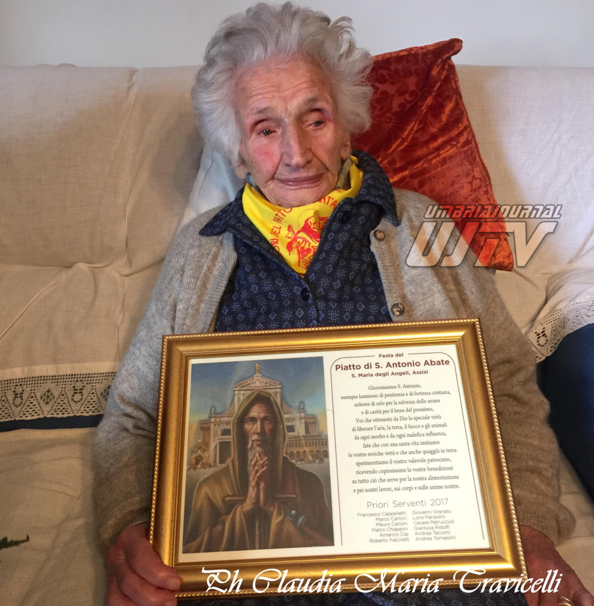 Nell’occasione della Festa del Piatto di Sant’Antonio, l’ Associazione Priori del Piatto di Sant’Antonio Abate di S.Maria degli Angeli – Assisi, ha voluto inviare e donare a Nonna Peppina una pergamena, con una lettera di dedica e l’omaggio del tipico menù del “Piatto di Sant’Antonio” cucinato e preparato con cura per lei e per i suoi cari dalla Taverna “Villa dei Priori”. Il tutto le è stato consegnato oggi, Domenica 21 Gennaio da Claudia Maria Travicelli e da Vittorio Ciancaleoni, giunti a farle visita a Castelfidardo, presso la casa della figlia Gabriella, luogo dove attualmente vive la splendida Nonna Peppina, nell’attesa di poter tornare presto nella sua casetta di legno a San Martino di Fiastra.