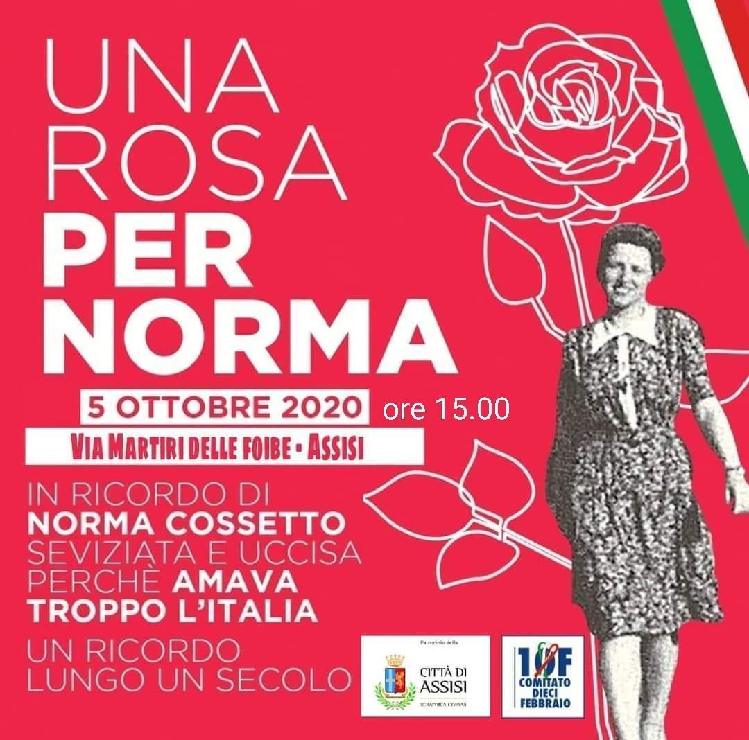 Si svolgerà lunedì 5 ottobre 2020, alle ore 15, in via Martiri delle Foibe, a Santa Maria degli Angeli, “Una rosa per Norma Cossetto”, la manifestazione promossa in tutta Italia dal Comitato 10 Febbraio che intende onorare la memoria della giovane studentessa istriana, seviziata e uccisa nel 1943 dai partigiani di Tito.