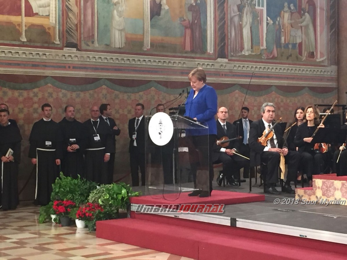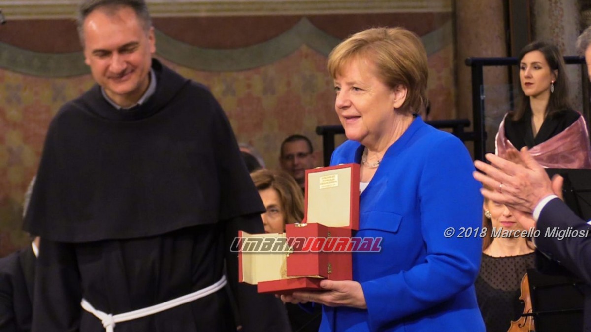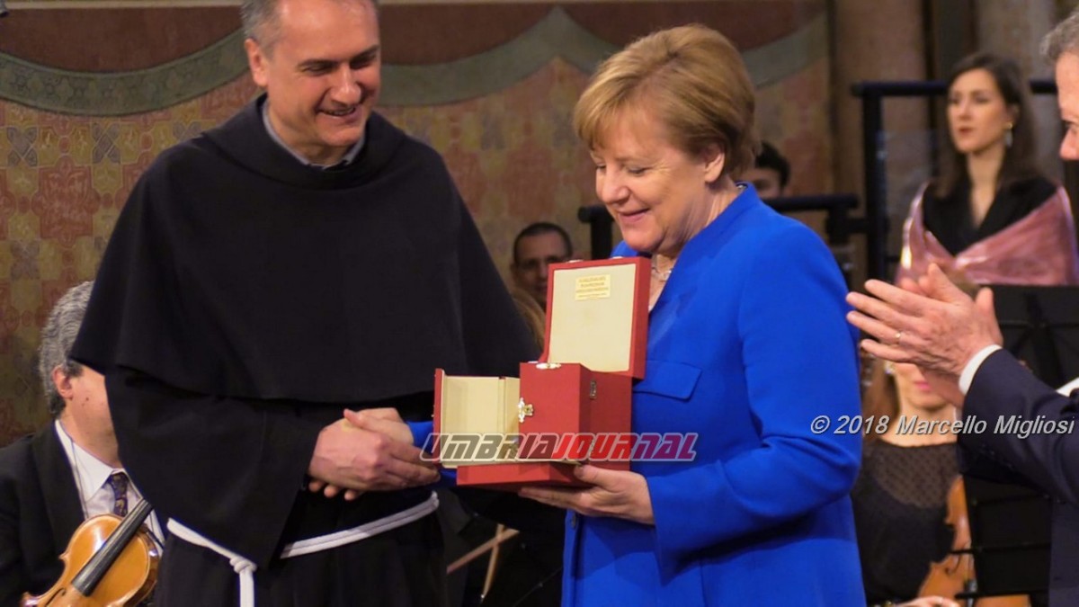 Angela Merkel riceve la lampada della pace, donata dai frati di Assisi