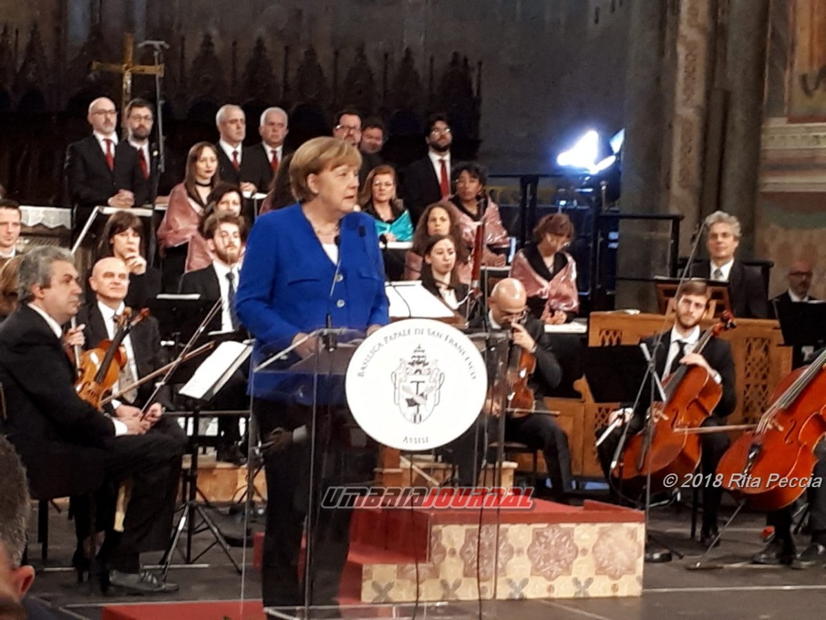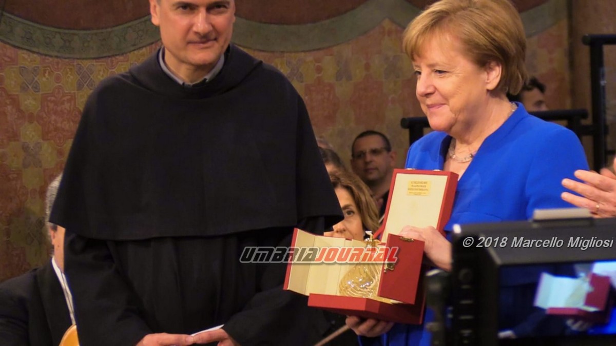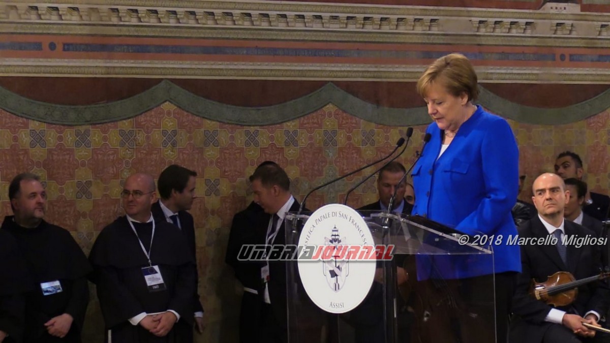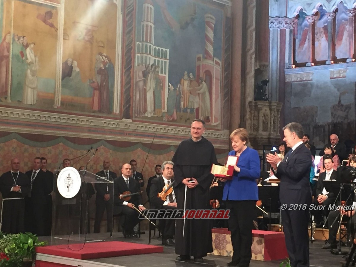 Angela Merkel riceve la lampada della pace, donata dai frati di Assisi