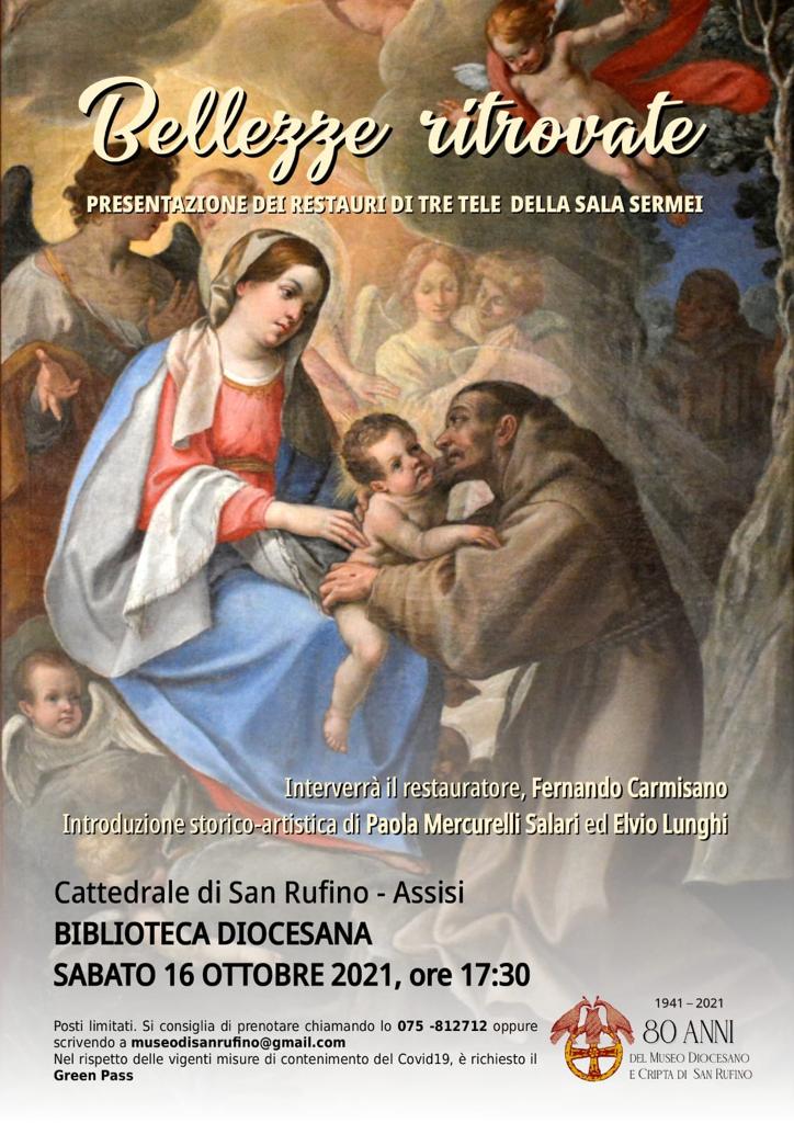 “Bellezze ritrovate” è il titolo dell’evento che si terrà sabato 16 ottobre alle ore 17,30 nella Biblioteca diocesana (in via del Torrione) del Polo culturale della cattedrale di Assisi, durante il quale verranno presentati i restauri di tre tele custodite nella Sala Sermei del Museo diocesano e Cripta di San Rufino.