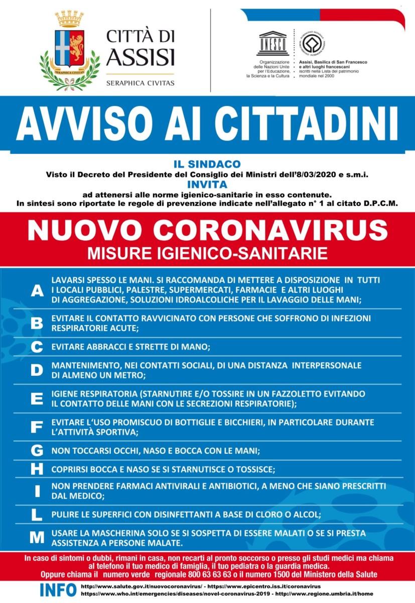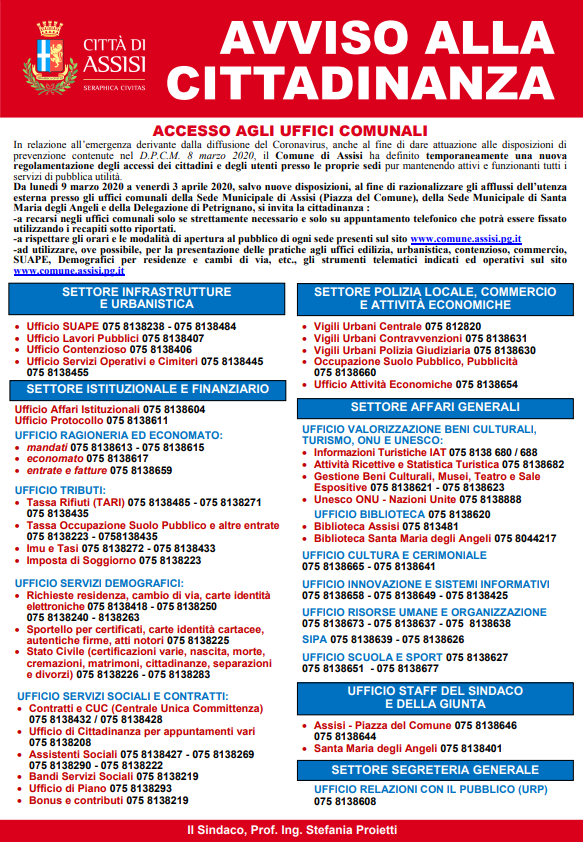 Tutti gli altri uffici sono comunque attivi e raggiungibili secondo le modalità comunicative già diffuse. Si invita la cittadinanza a utilizzare il più possibile gli strumenti telematici presenti sul sito www.comune.assisi.pg.it