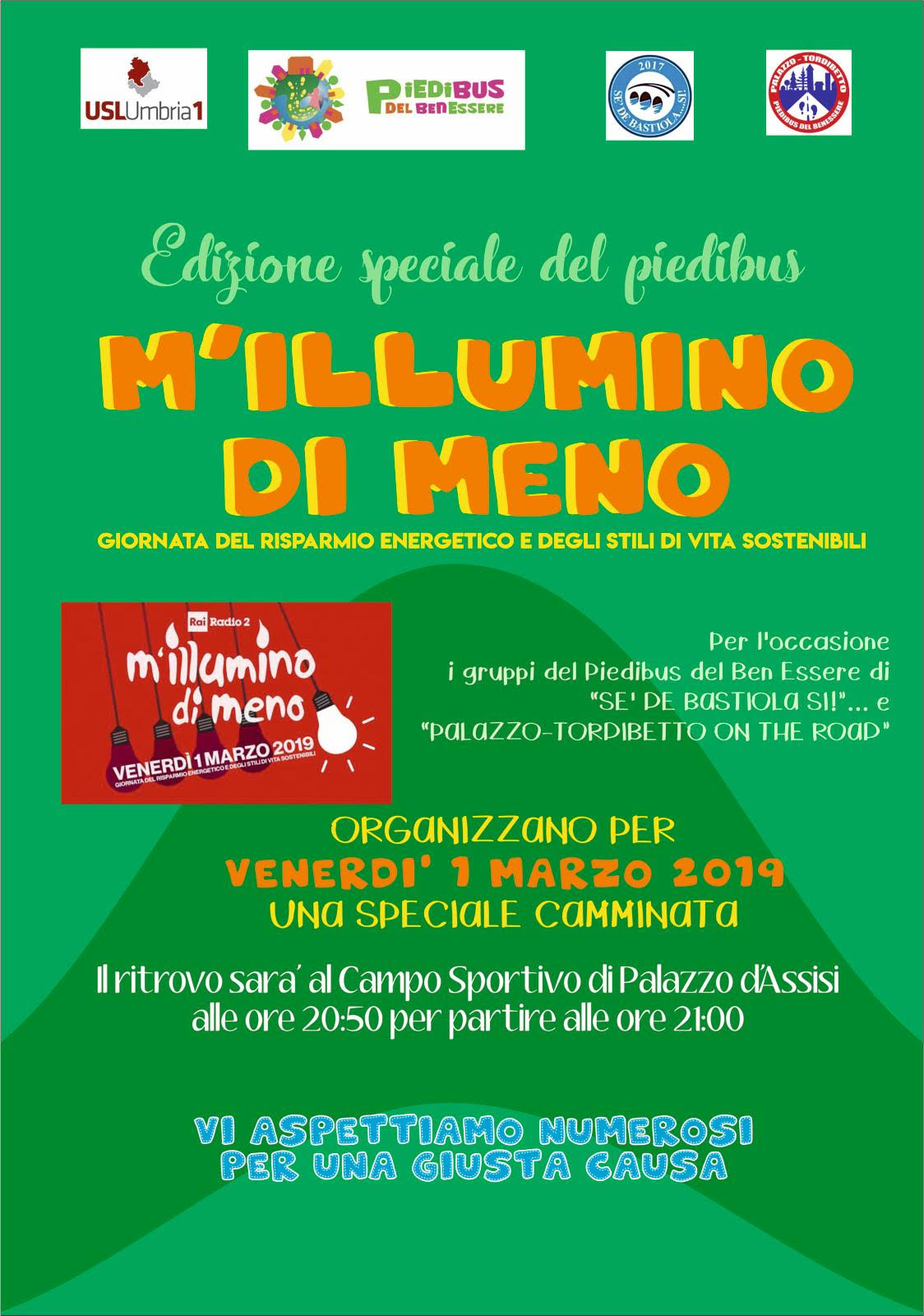 M’illumino di Meno 2019 giornata del risparmio Energetico e degli stili di vita sostenibili, PER L’OCCASIONE I GRUPPI DEL PIEDIBUS DEL BEN ESSERE DI ” SE’ DE LA BASTIOLA SI !….” E ” PALAZZO – TORDIBETTO ON THE ROAD” organizzano un’edizione speciale del Piedibus. Venerdì 1 MARZO 2019 si svolgerà una “Speciale Camminata”, il ritrovo è previsto alle ora 20.50 per partire alle ore 21.00 presso il CAMPO SPORTIVO DI PALAZZO DI ASSISI.