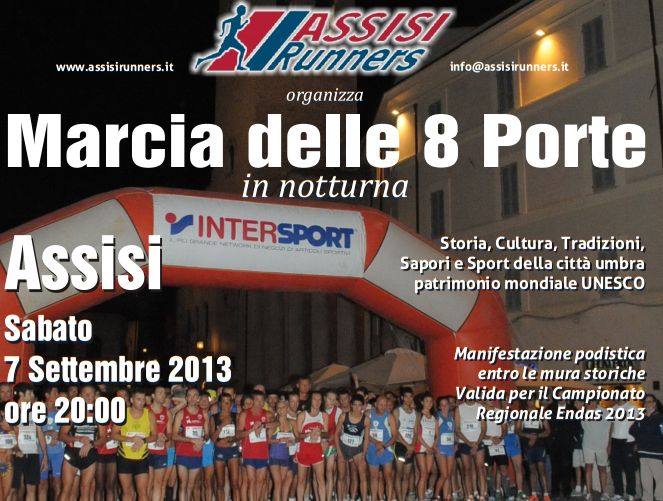 Ancora poche ore e poi Assisi farà da palcoscenico alla seconda edizione della Marcia delle Otto Porte, manifestazione podistica organizzata dall’Assisi Runners in programma sabato sera 7 settembre con partenza ed arrivo nello splendido scenario di Piazza del Comune alle ore 20, valida quale prova del Campionato Umbro Endas 2013. Le caratteristiche vie e piazze del centro storico della città natale di San Francesco, patrimonio mondiale Unesco, sono pronte ad accogliere la massa di podisti, lo scorso anno furono oltre trecento, che gareggeranno su una distanza di circa 7.000 metri, ma ci sarà anche la parte non agonistica aperta a tutti i camminatori che vorranno cimentarsi sullo stesso percorso di 7 km. o su quello ridotto di 2,5 Km.
