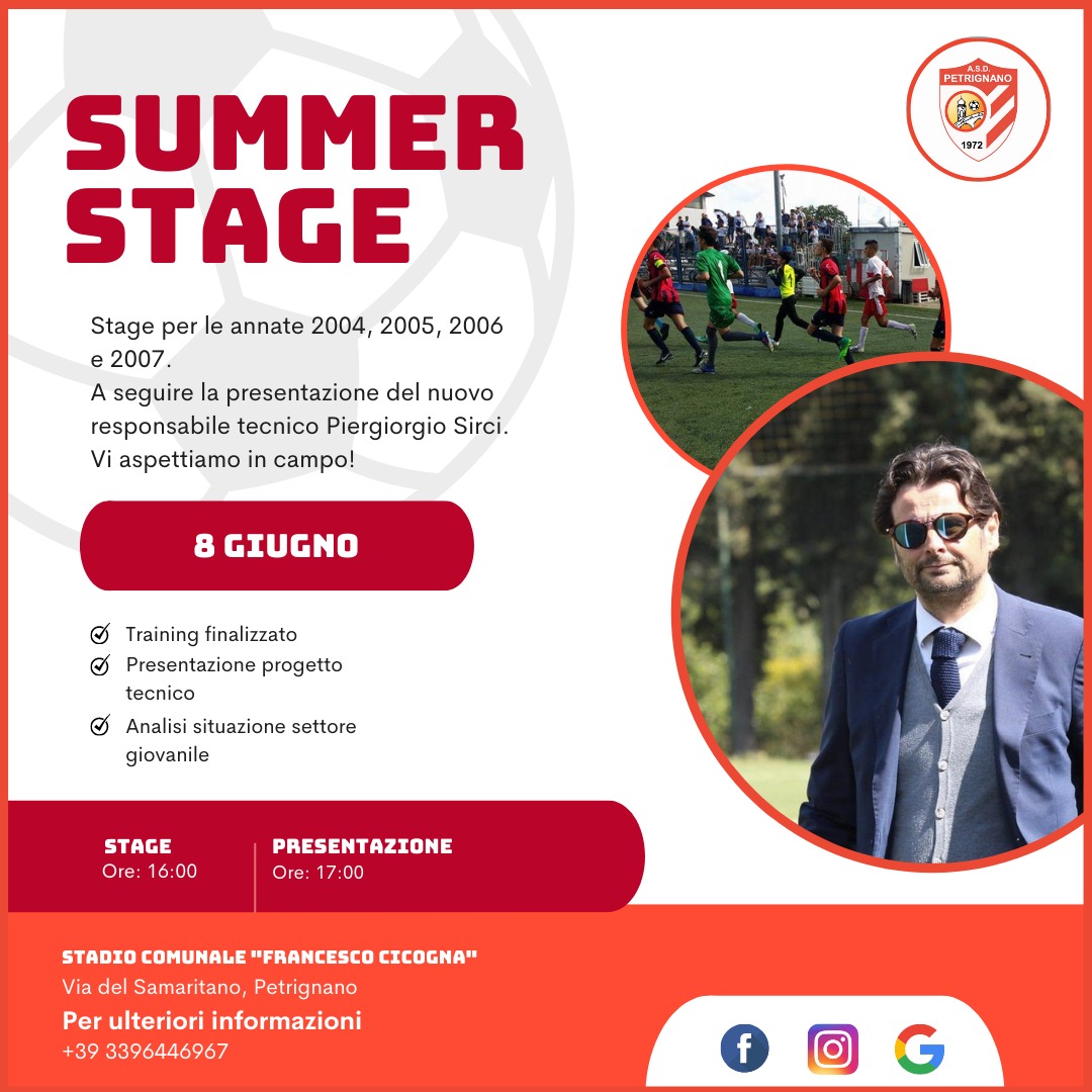 L’ASD Petrignano non perde tempo e pensa già alla prossima stagione. Per il giorno 8 giugno, alle ore 16 presso il Campo Sportivo “Francesco Cicogna“, la società ha deciso di organizzare un “Summer Stage” per i calciatori delle annate che vanno dal 2004 al 2007. L’obiettivo è quello di porre solide basi per la stagione sportiva che verrà, approcciandosi preventivamente con i ragazzi che andranno a comporre il prossimo anno il settore giovanile – e non solo.