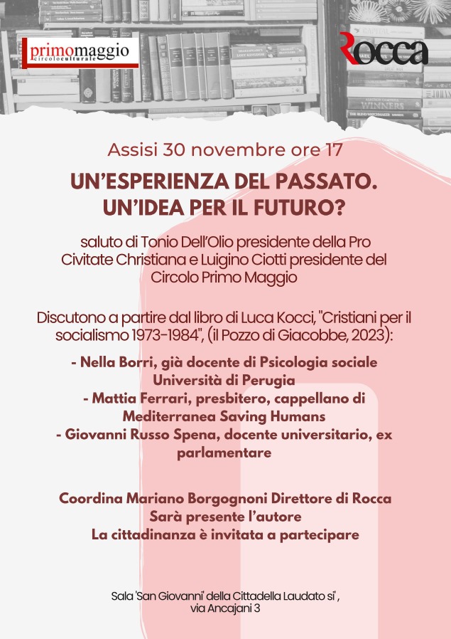 Incontro a Assisi – La Cittadella Laudato si’ di Assisi ospiterà il prossimo 30 novembre 2024 alle 17:00 un evento culturale di rilevante importanza, intitolato “Un’esperienza del passato. Un’idea per il futuro?”. L’incontro si terrà presso la Sala San Giovanni (via Ancajani 3) e offrirà l’opportunità di riflettere sul legame tra il cristianesimo e l’impegno politico, partendo dal libro di Luca Kocci, intitolato Cristiani per il socialismo 1973-1984 (edito da Il Pozzo di Giacobbe nel 2023).