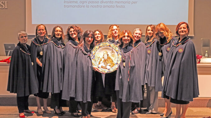Alla priora Tiziana Borsellini il compito di illustrare, dopo lo scoprimento, l’opera pittorica identificativa del Piatto 2025, dell’artista Valentina Segoloni. Un dipinto a mano su ceramica di 52 cm di diametro, denominato Piatto della Carità di sant’Antonio Abate, prioranza anno giubilare 2025. Un sant’Antonio che campeggia su una cornice con richiami della ceramica derutese, in cui  è simbolicamente raffigurata la prioranza femminile in cammino verso la Porziuncola. Alla priora Roberta Rosati il compito di presentare i contenuti del programma, espresso in una significativa grafica rinnovata.