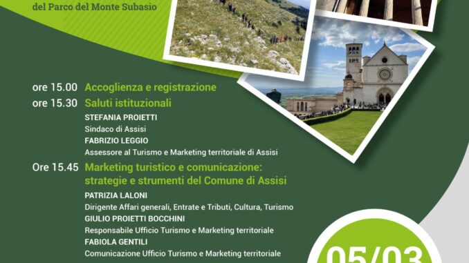 “L’idea – sottolinea Fabrizio Leggio, assessore al Turismo e Marketing territoriale – è quella di fare il punto della situazione del turismo ad Assisi e nel territorio del Parco del Monte Subasio e definire insieme nuove strategie e opportunità sul fronte dell’accoglienza. Sarà un momento di confronto e condivisione, anche con lo sguardo verso il Parco del Subasio, rispetto al quale è in atto un progetto di valorizzazione regionale con i Comuni dell’area, di cui il nostro ente è capofila. Auspichiamo un’ampia partecipazione, anche per affrontare al meglio le sfide legate alla nuova strategia di promozione della città e del territorio”.