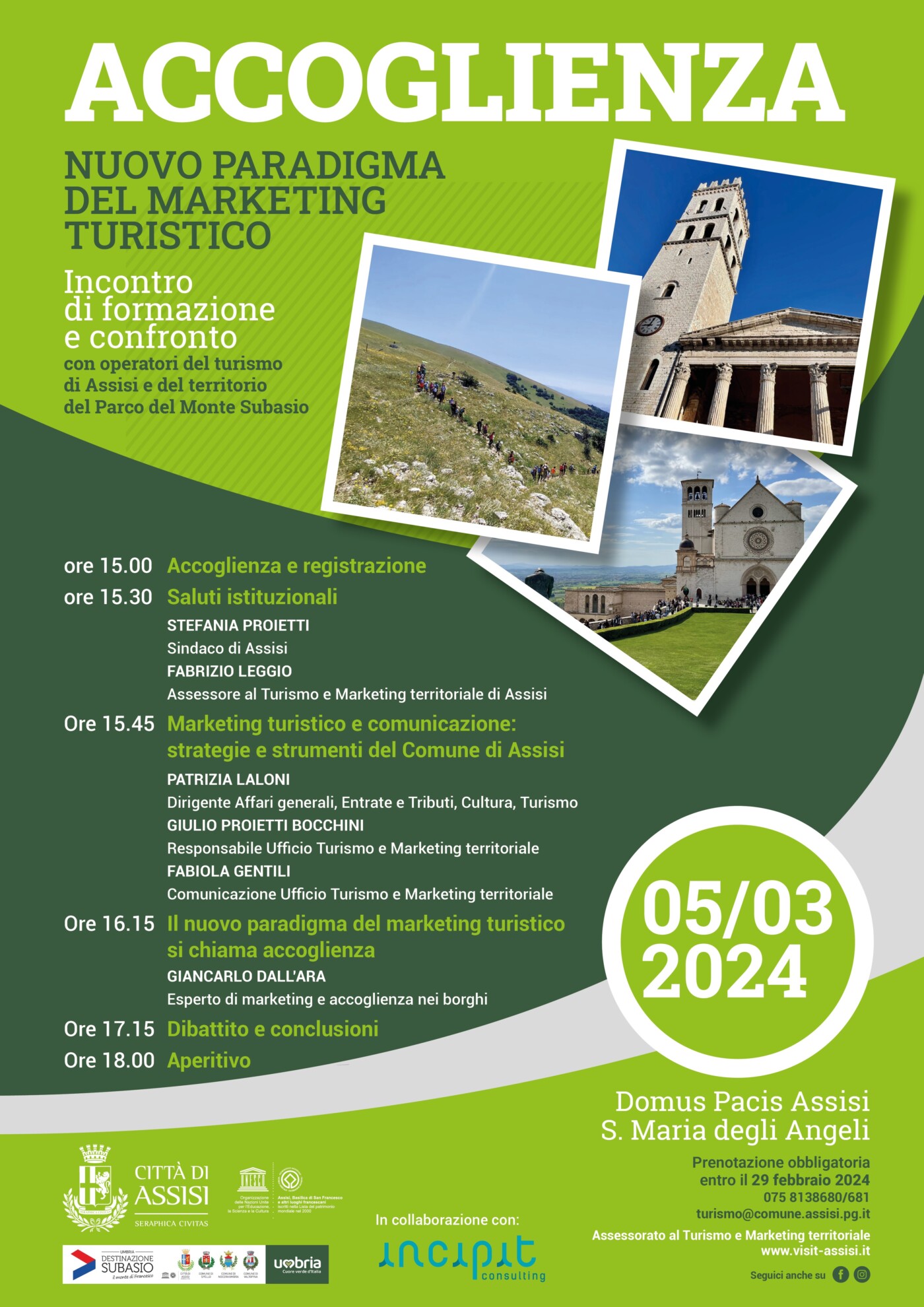 Assisi, regina e traino del flusso turistico in Umbria con oltre 1,4 milioni di presenze nel 2023, guarda al futuro del settore con nuove strategie di promozione e accoglienza, che passano anche attraverso un nuovo protagonismo degli operatori. A tale scopo, l’ufficio Turismo e Marketing territoriale del Comune ha promosso un incontro di formazione e confronto, rivolto ad addetti ai lavori della città e del territorio del Parco del Monte Subasio. L’evento – intitolato “Accoglienza, nuovo paradigma del marketing turistico” – si terrà il 5 marzo prossimo, alla Domus Pacis a Santa Maria degli Angeli, con l’intervento del professor Giancarlo Dall’Ara, uno dei massimi esperti in Italia di marketing e accoglienza nei borghi.