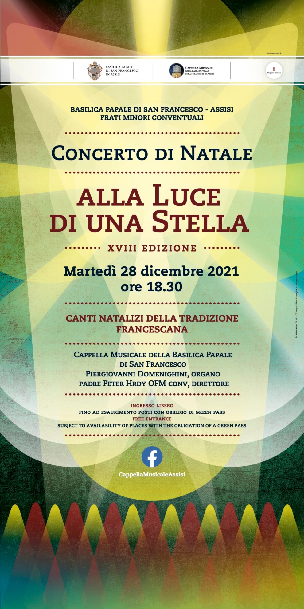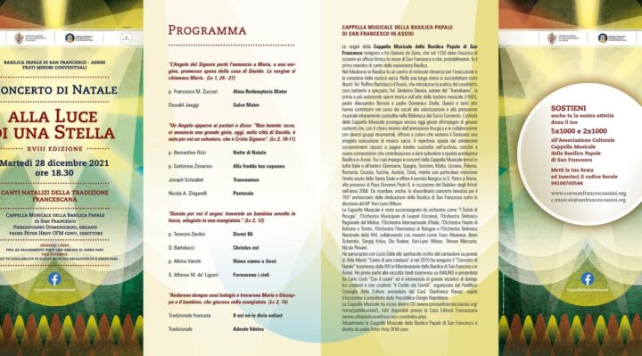 Sarà l’occasione per ascoltare i canti natalizi della tradizione francescana, con le voci della Cappella Musicale della Basilica Papale di San Francesco in Assisi, all’organo Piergiovanni Domenighini. Dirige Padre Peter Hrdy OFM conve.