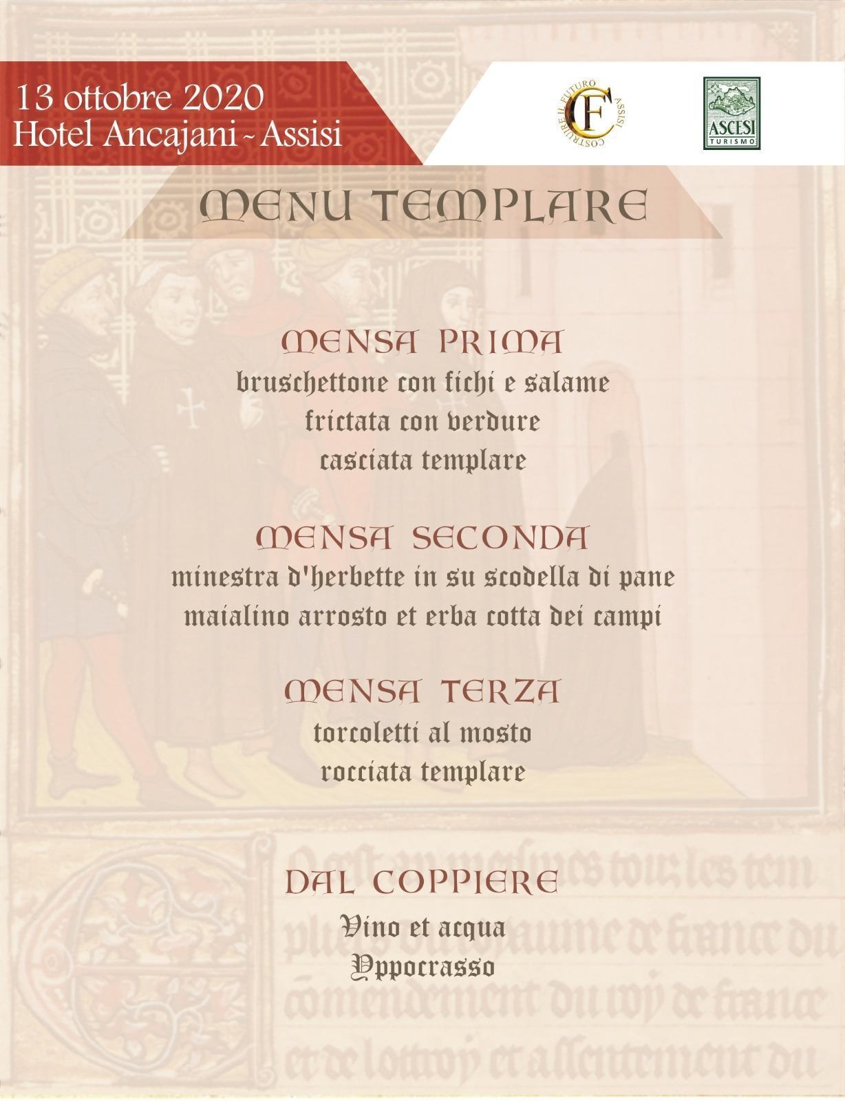 La conferenza sarà allietata da un aperitivo di benvenuto e, a seguire, da una cena con menù templare (come da locandina allegata). Sarà a numero chiuso nel rispetto del distanziamento e delle normative vigenti anti Covid. L’iniziativa gode del patrocinio ed è già stata veicolata da: Scriptorium, Arna Templare, Festival del Mediievo, Strada dei Templari e Project Beauceant. Per info e prenotazioni: 3493600393.