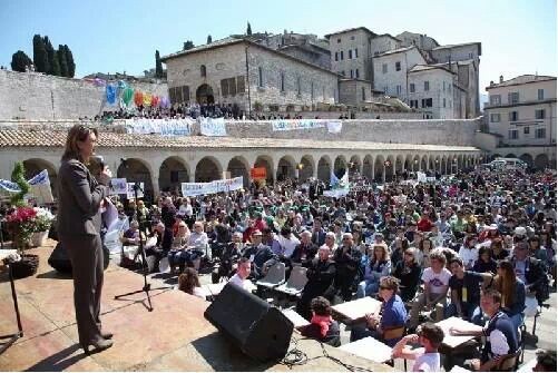 Si è conclusa questa mattina nella Basilica di San Francesco d’Assisi la due giorni delle scuole di pace. Seduti ai piedi degli affreschi di Giotto e dei suoi compagni, duemila giovani hanno sottoscritto la Carta di Assisi: otto impegni per ridare valore e concretezza alla pace, alla fraternità e al dialogo a partire dai giovani e dalla scuola. Una pioggia battente ha costretto gli organizzatori del Meeting a spostare la sessione conclusiva all’interno della Basilica offrendo agli studenti un’opportunità straordinaria: rinnovare il proprio impegno per la pace “sui passi di Francesco” nel luogo più solenne di Assisi. La Carta di Assisi, che sarà consegnata nei prossimi giorni al Ministro dell’Istruzione Stefania Giannini, è alla base di un ricco programma di attività con cui la neonata “Rete nazionale delle scuole di pace” si propone di rendere permanente l’educazione alla cittadinanza democratica nella scuola italiana. La scuola, raccogliendo l’indicazione del Parlamento (legge 24/2005), da ora in avanti è chiamata a celebrare San Francesco con azioni educative integrate nella programmazione scolastica.